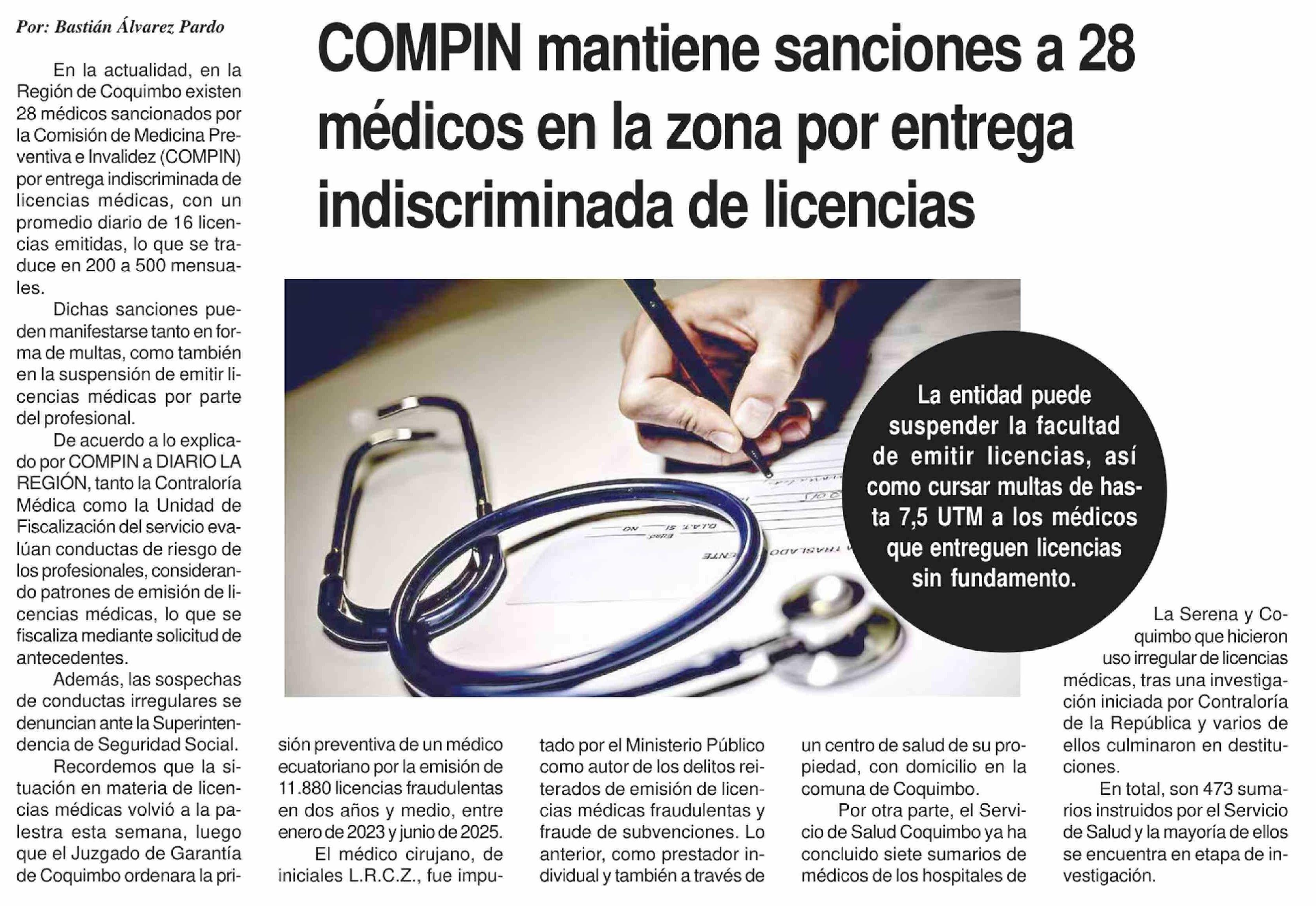 Título: COMPIN mantiene sanciones a 28 médicos en la zona por entrega indiscriminada de licencias