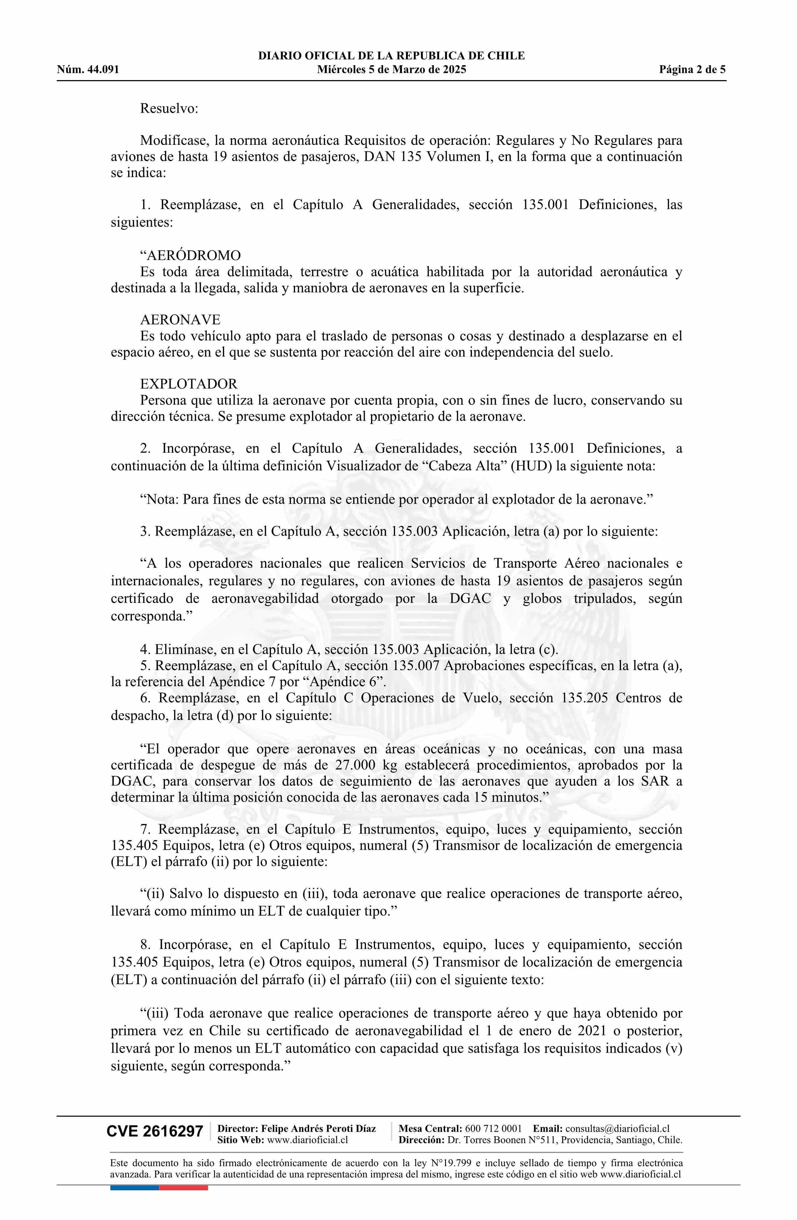 | Título: | Resolución exenta número 04/3/0148/1967, de 2024.- Modifica norma aeronáutica Requisitos de operación: regulares y no regulares para aviones de hasta 19 asientos de pasajeros, DAN 135 Volumen I |