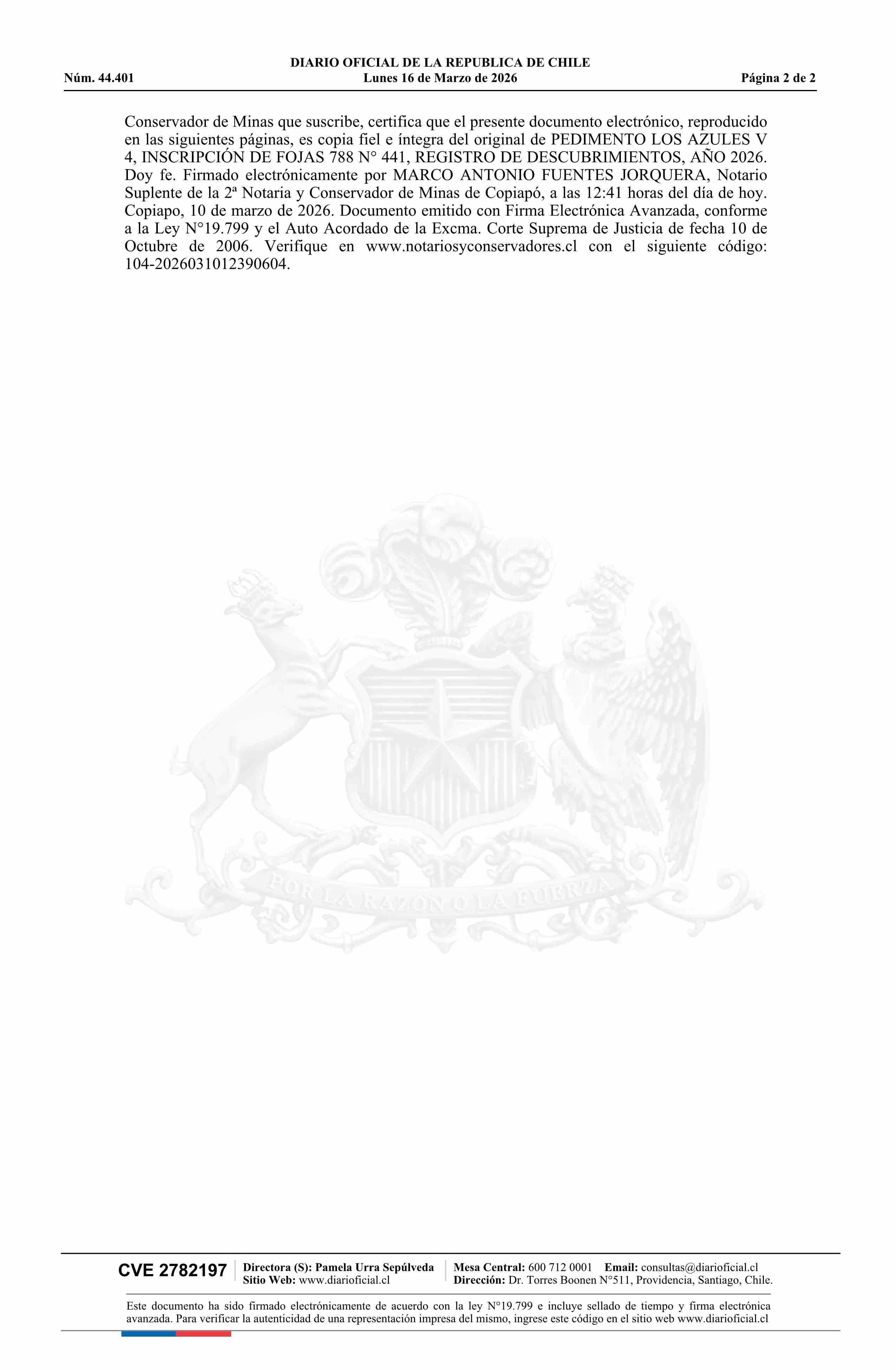 LOS AZULES V 4 / American Sierra Gold Chile SpA 16-03-2026 DIARIO OFICIAL CHILE - BOLETÍN OFICIAL DE MINERÍA |