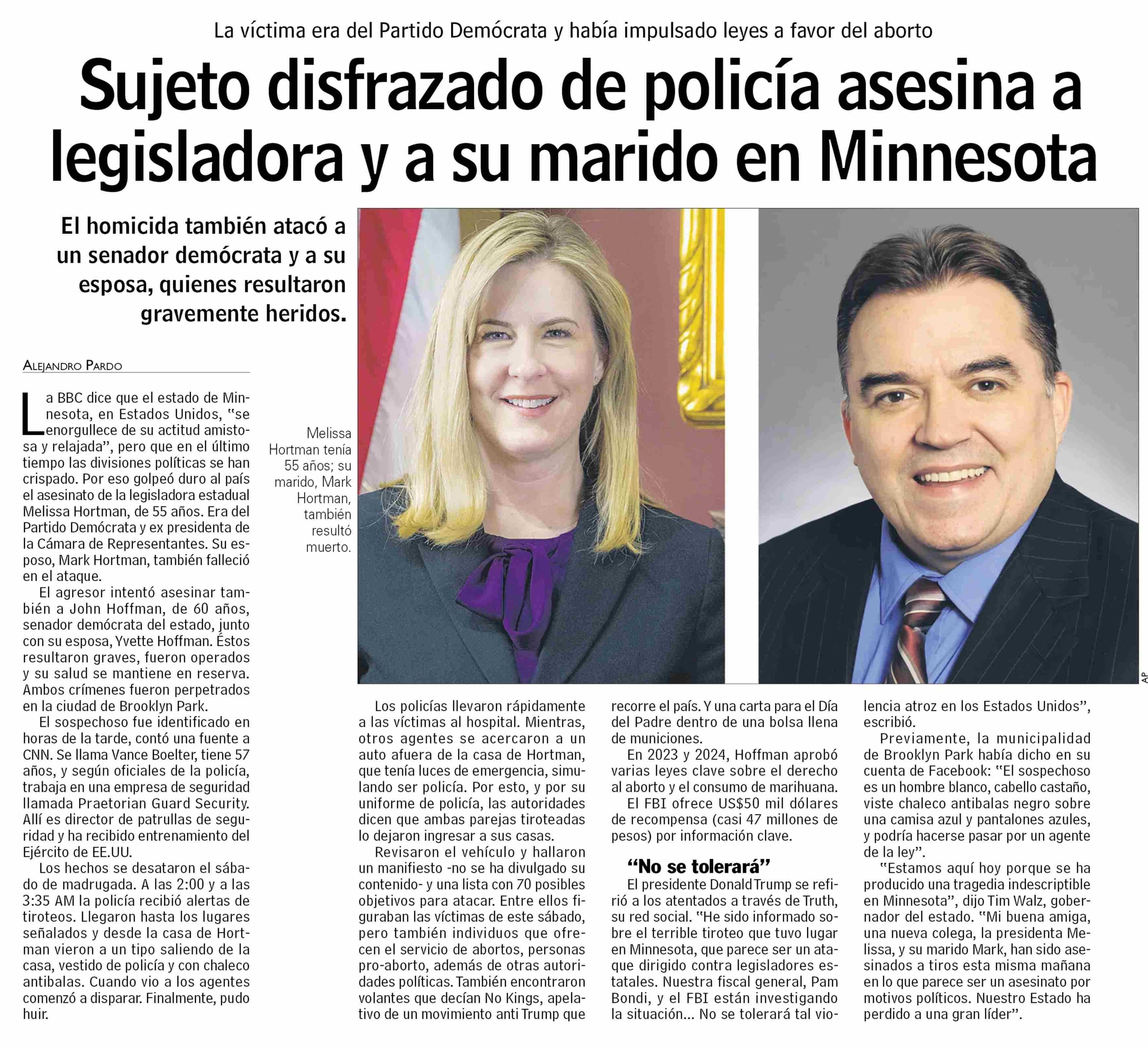 Sujeto disfrazado de policia asesina a legisladora y a su marido en Minnesota 15-06-2025 Las Últimas Noticias |