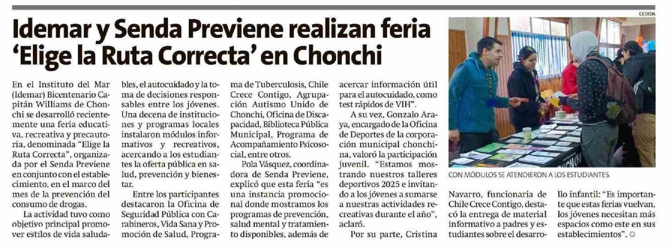 Idemar y Senda Previene realizan feria 'Elige la Ruta Correcta' en Chonchi 09-06-2025 La Estrella de Chiloé |