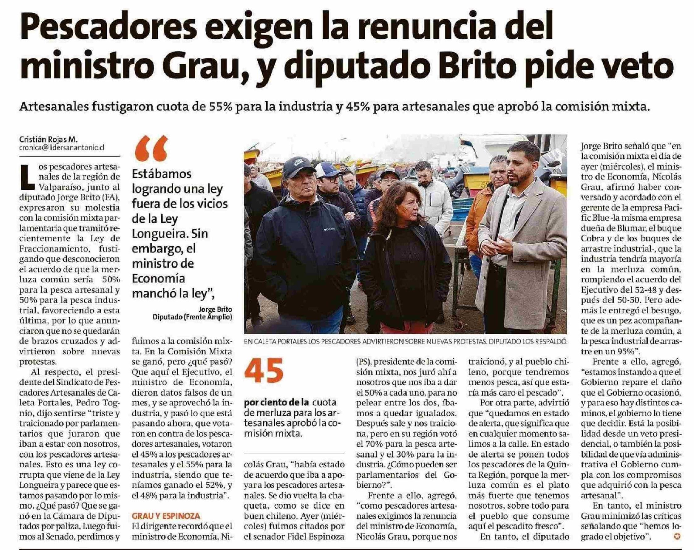 Título: Pescadores exigen la renuncia del ministro Grau, y diputado Brito pide veto