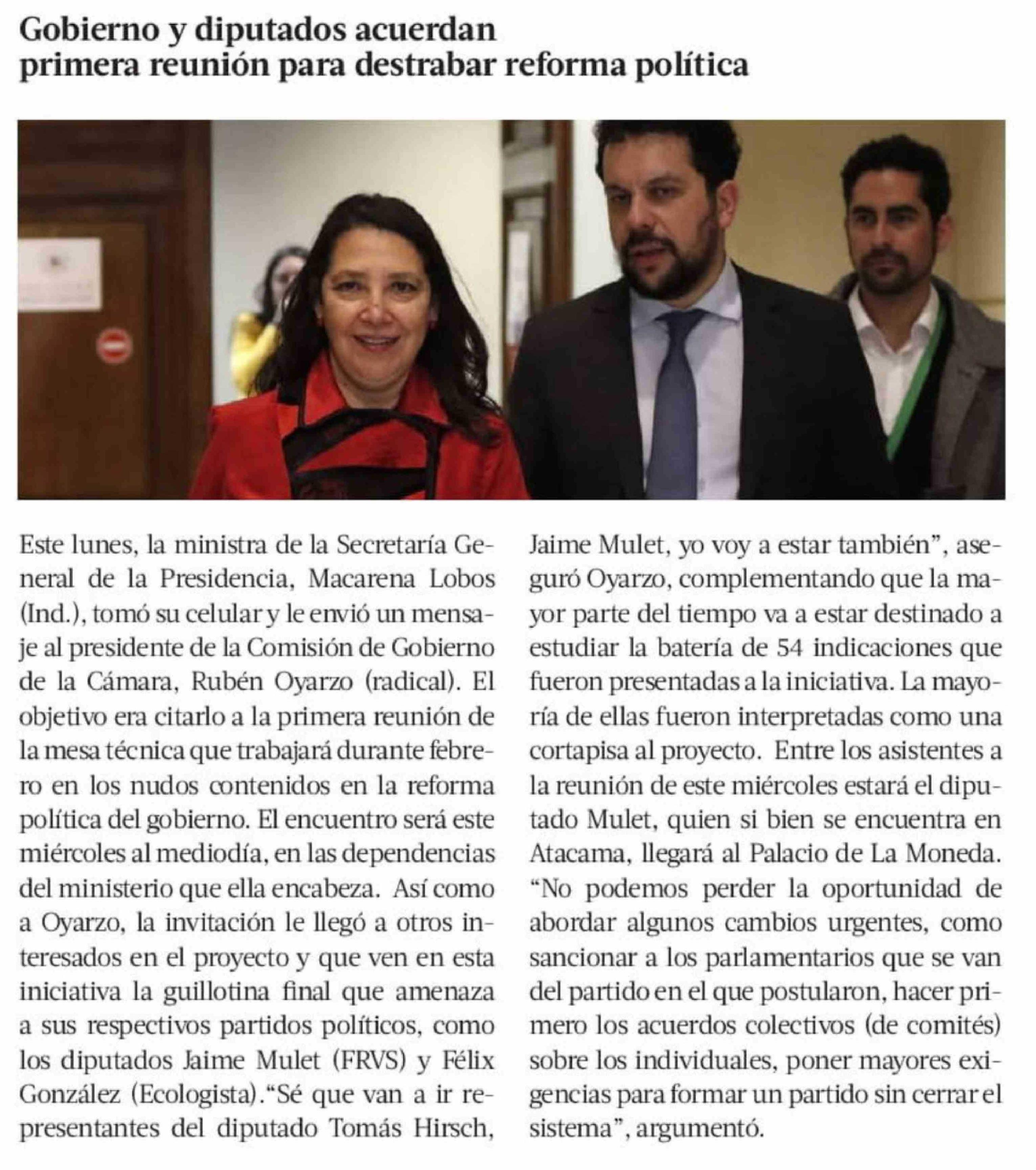 Gobierno y diputados acuerdan primera reunión para destrabar reforma política 11-02-2026 La Tercera |
