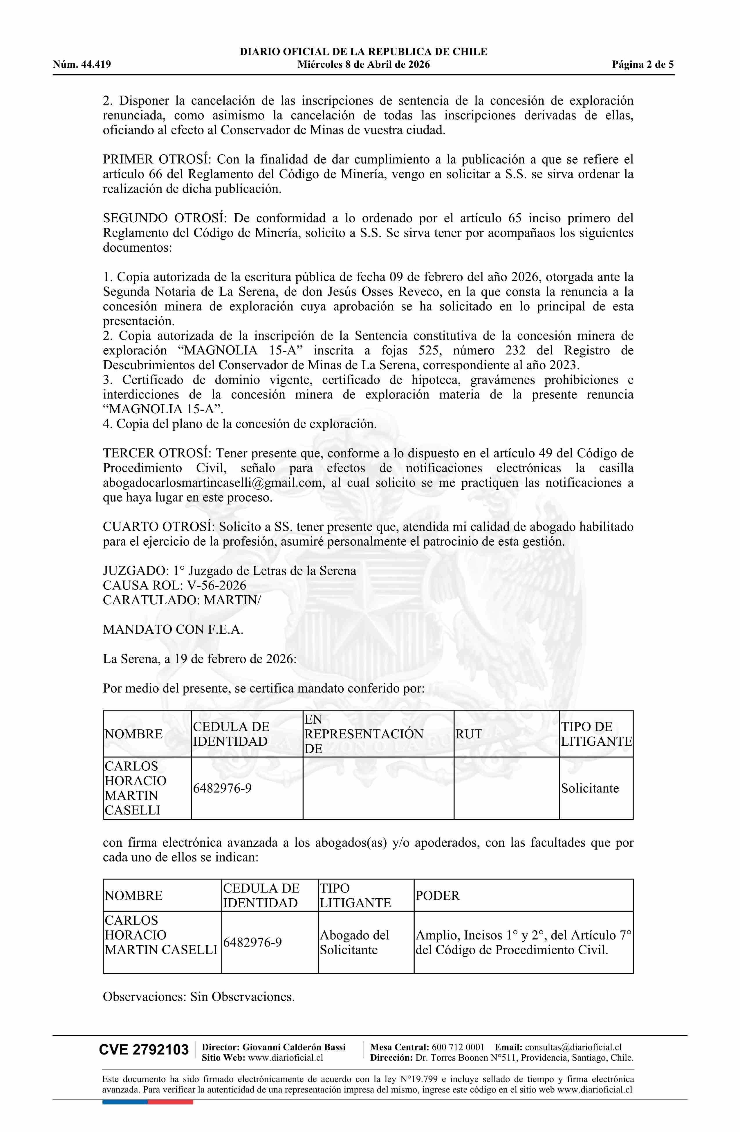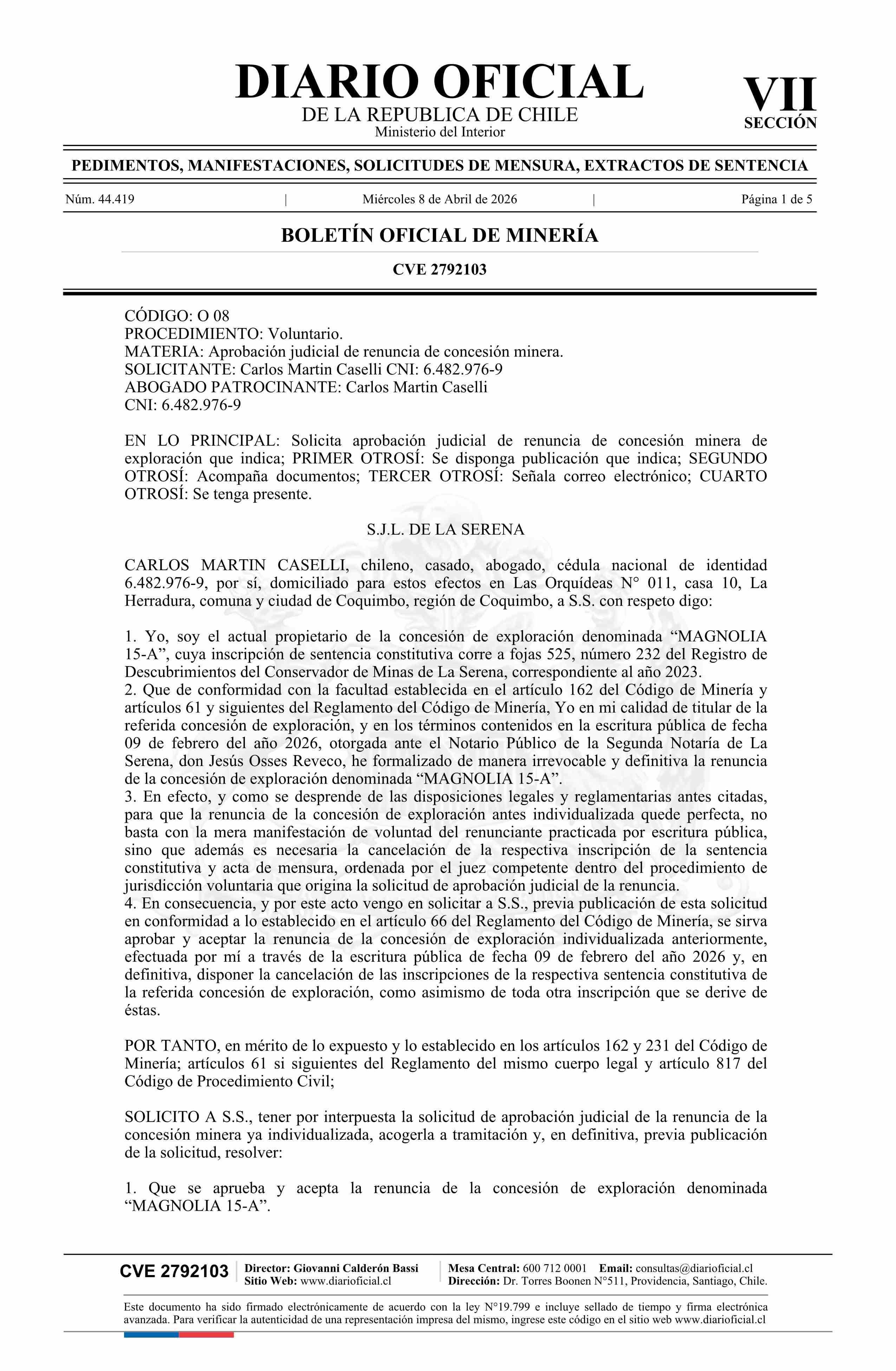 MAGNOLIA 15-A / Martin Caselli Carlos 08-04-2026 DIARIO OFICIAL CHILE - BOLETÍN OFICIAL DE MINERÍA |