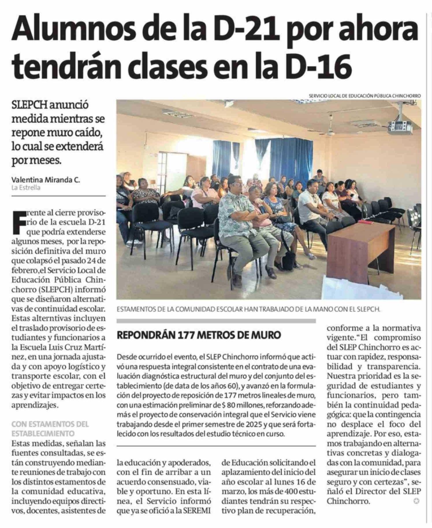 Alumnos de la D-21 por ahora tendrán clases en la D-16 04-03-2026 La Estrella de Arica |