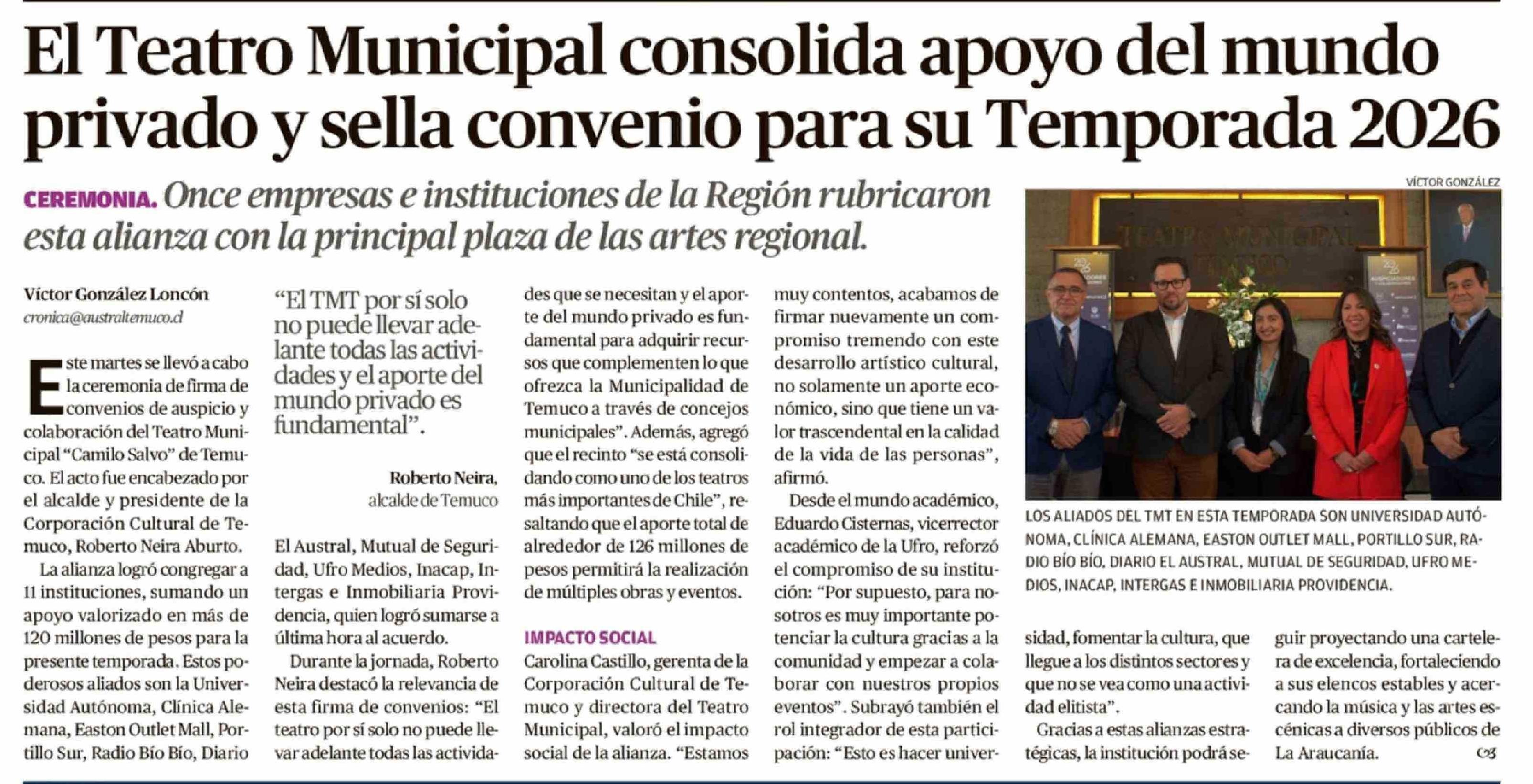 Título: El Teatro Municipal consolida apoyo del mundo privado y sella convenio para su Temporada 2026