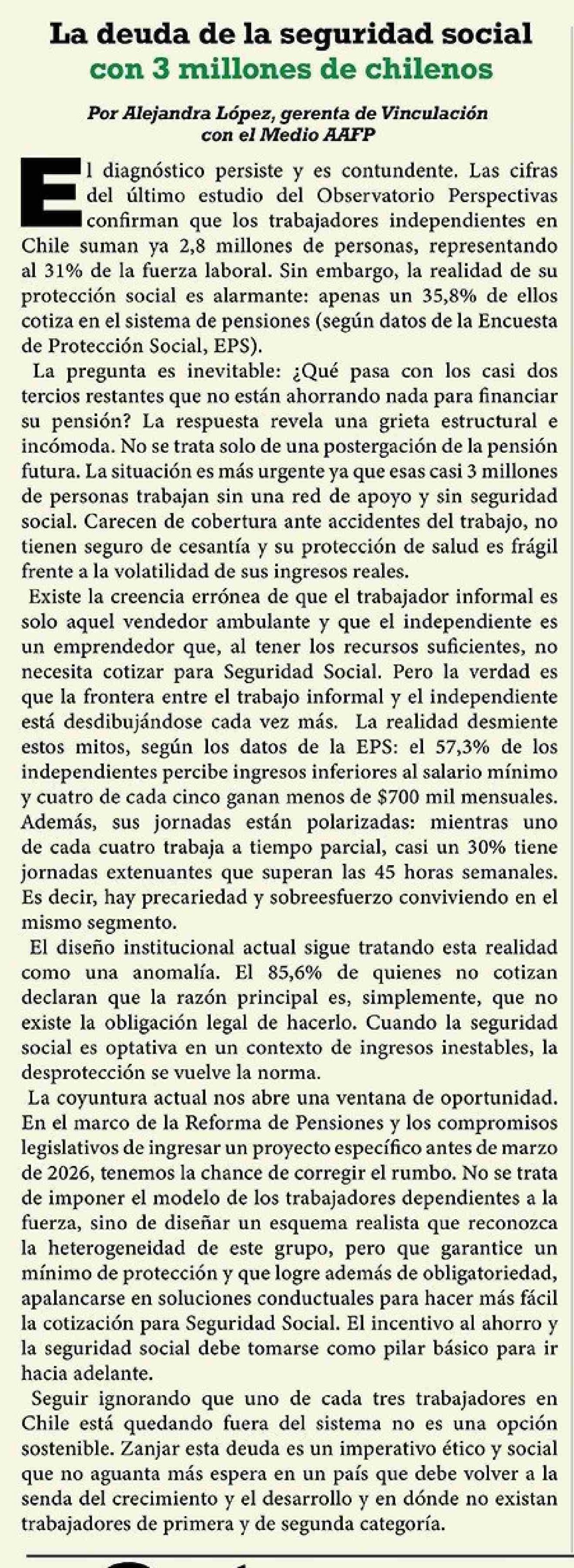 Título: Columnas de Opinión: La deuda de la seguridad social con 3 millones de chilenos