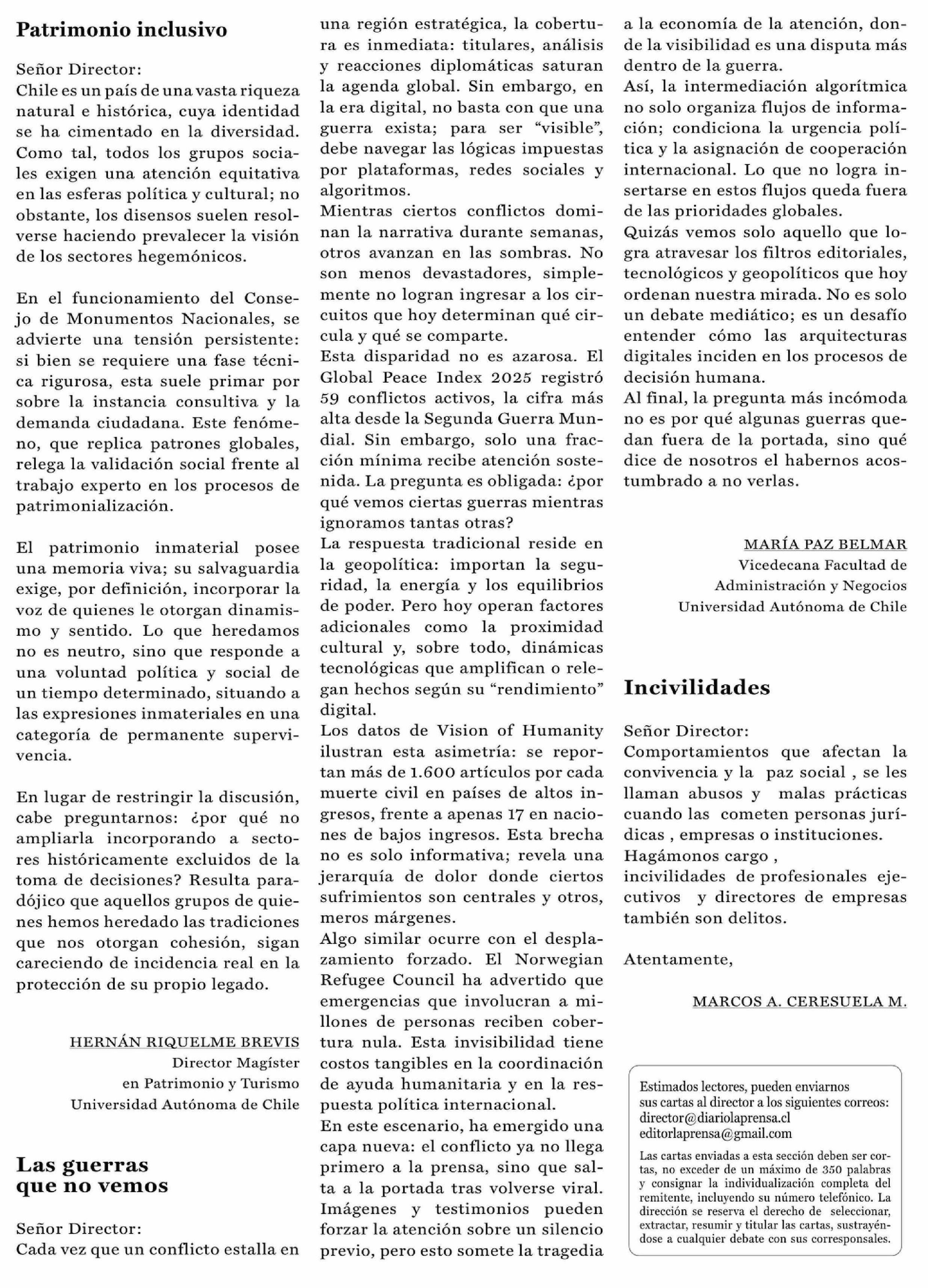 Cartas: Las guerras que no vemos 23-04-2026 La Prensa de Curicó |