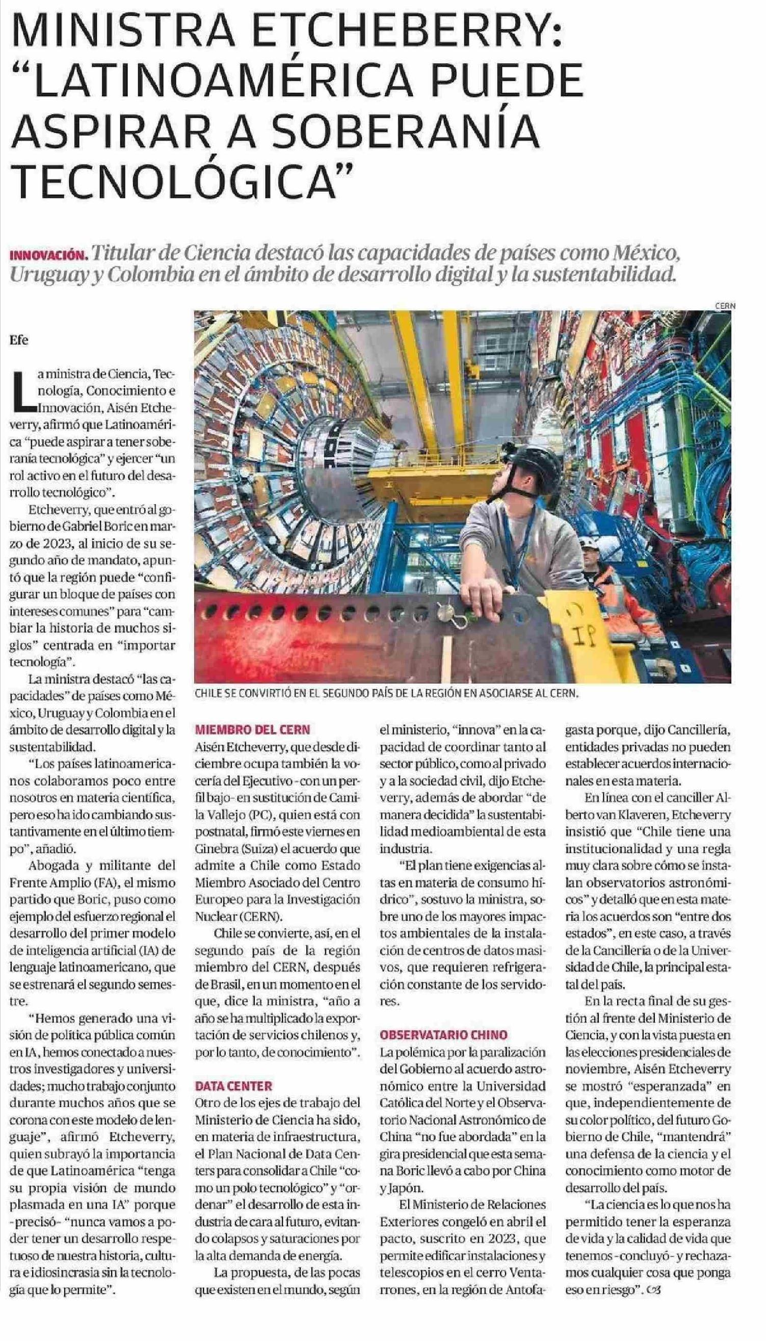 MINISTRA ETCHEBERRY: “LATINOAMERICA PUEDE ASPIRAR A SOBERANIA TECNOLÓGICA” 19-05-2025 El Mercurio de Antofagasta |