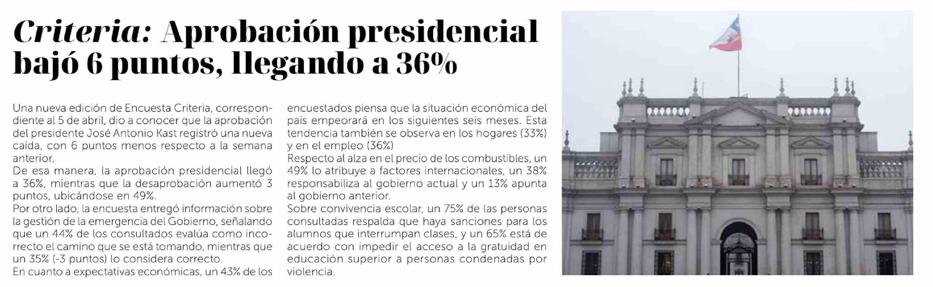 Título: Criteria: Aprobación presidencial bajó 6 puntos, llegando a 36%