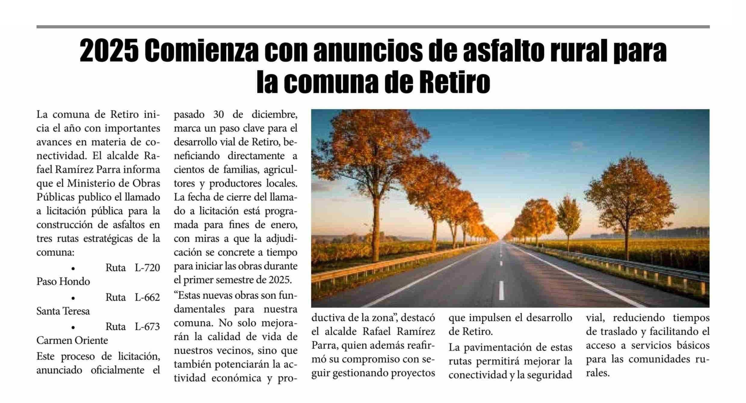 2025 Comienza con anuncios de asfalto rural para la comuna de Retiro 03-01-2025 El Lector |