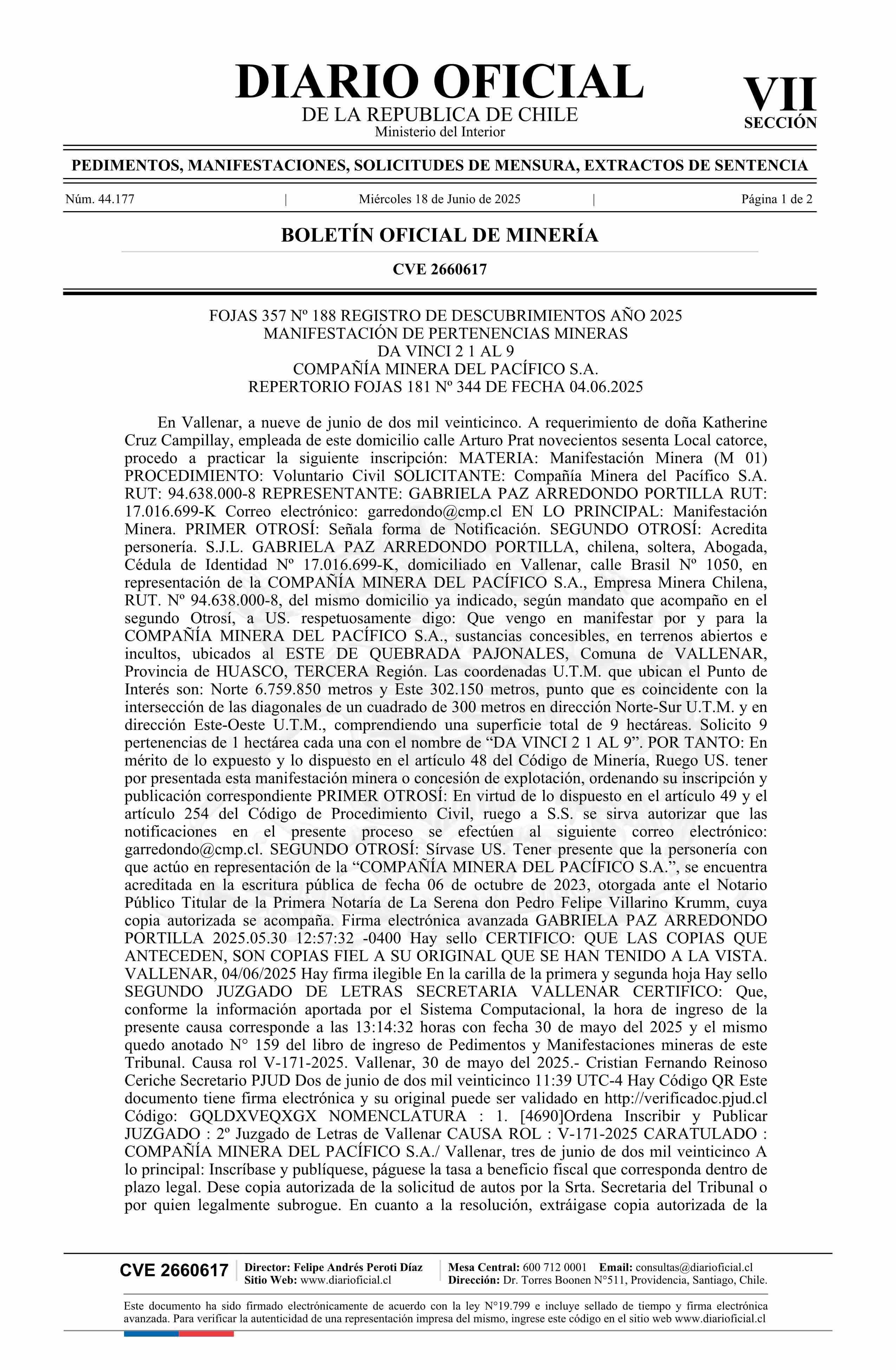 DA VINCI 2 1 AL 9 / Compañía Minera del Pacífico S.A. 18-06-2025 DIARIO OFICIAL CHILE - BOLETÍN OFICIAL DE MINERÍA |