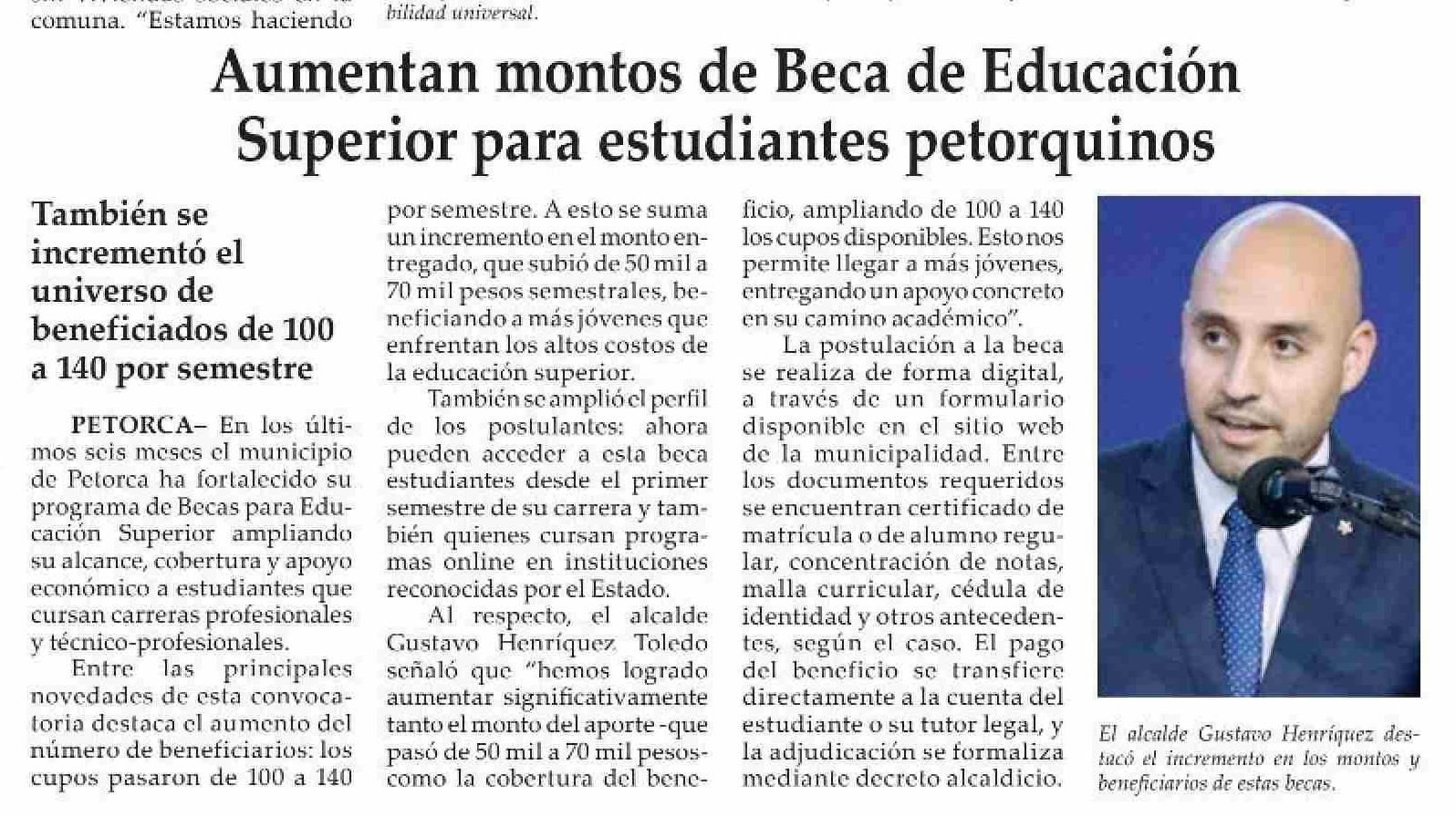 | Título: | Aumentan montos de Beca de Educación Superior para estudiantes petorquinos |