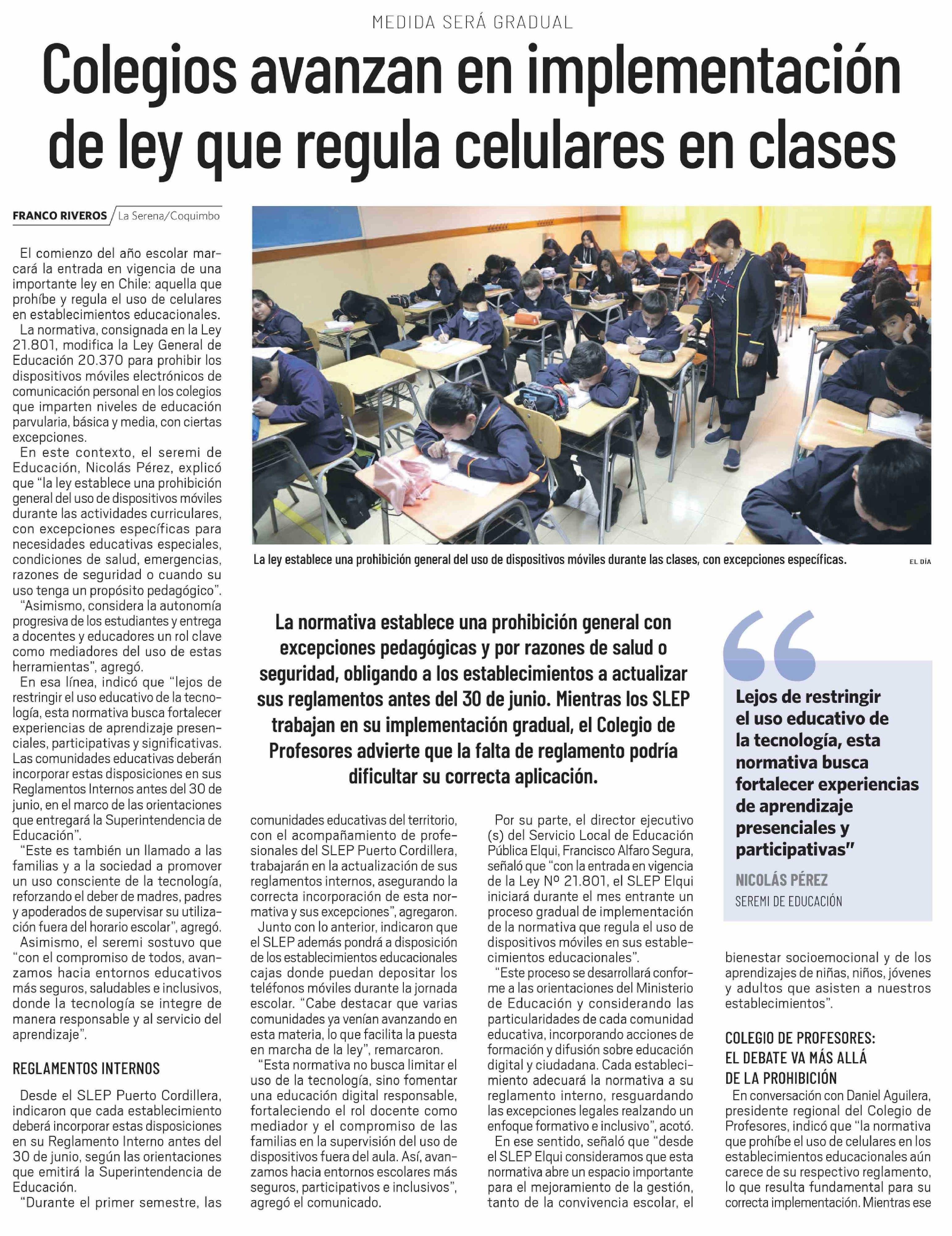 Título: Colegios avanzan en implementación de ley que regula celulares en clases