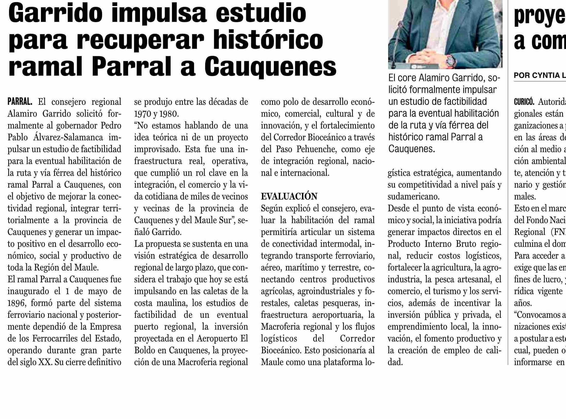 | Título: | Consejero regional Alamiro Garrido impulsa estudio para recuperar histórico ramal Parral a Cauquenes |