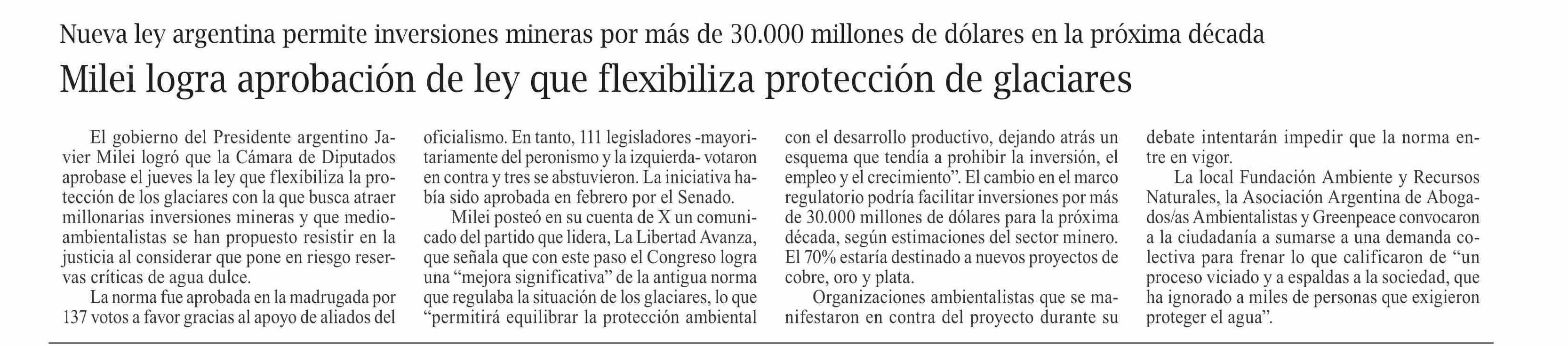 Título: Milei logra aprobación de ley que flexibiliza protección de glaciares