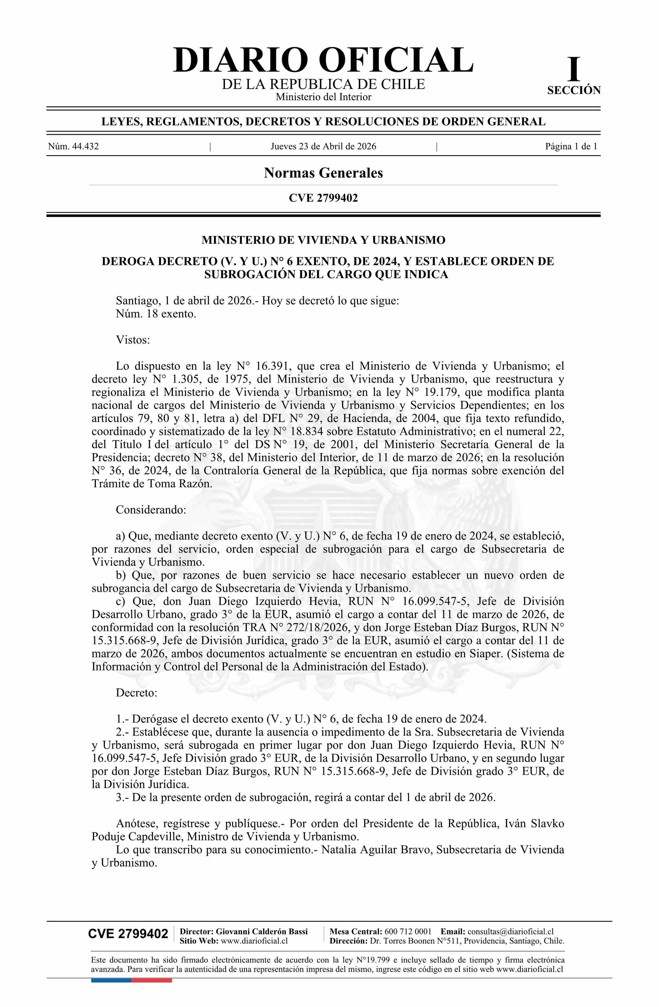 Decreto exento número 18, de 2026.- Deroga decreto N° 6 exento, de 2024, y establece orden de subrogación del cargo que indica 23-04-2026 Diario Oficial Edición Electrónica |
