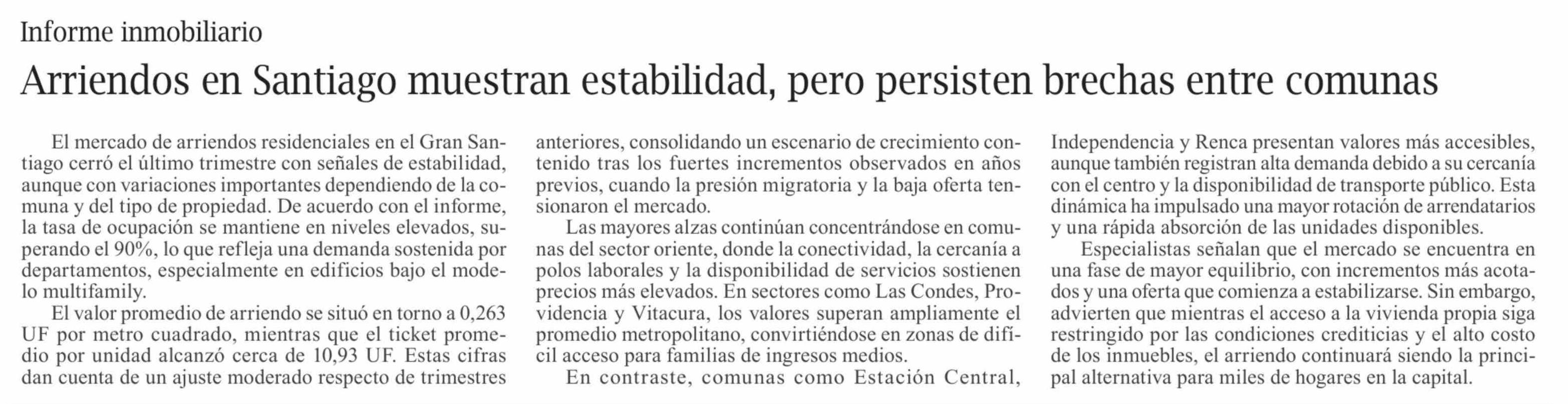 | Título: | Arriendos en Santiago muestran estabilidad, pero persisten brechas entre comunas |