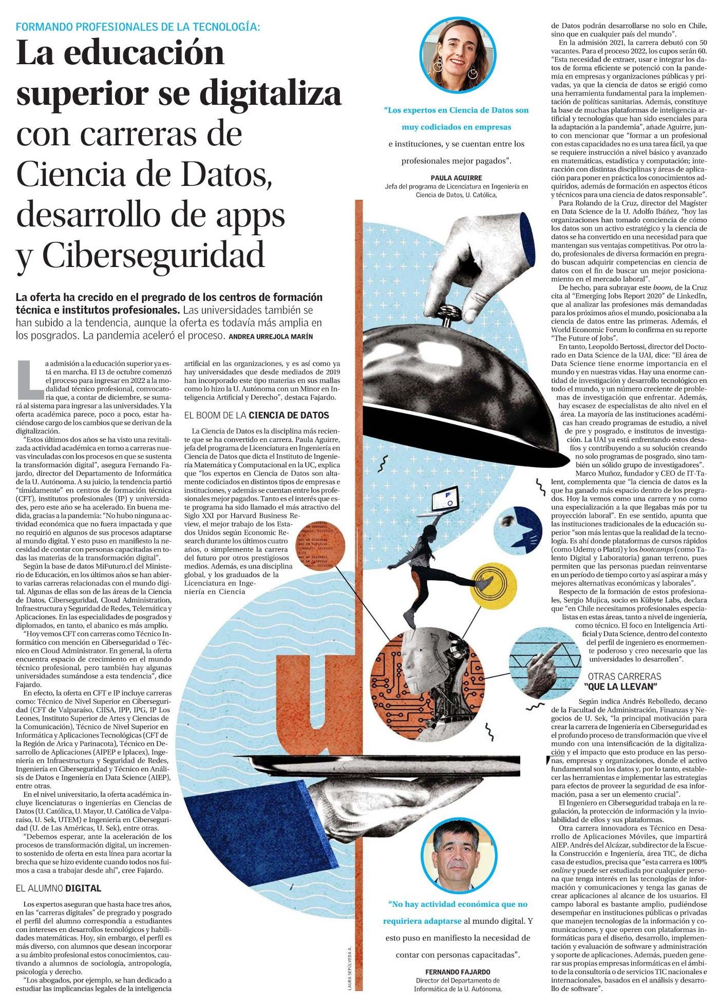 La educación superior se digitaliza con carreras de Ciencia de Datos, desarrollo de apps y Ciberseguridad 18-11-2021 El Mercurio |