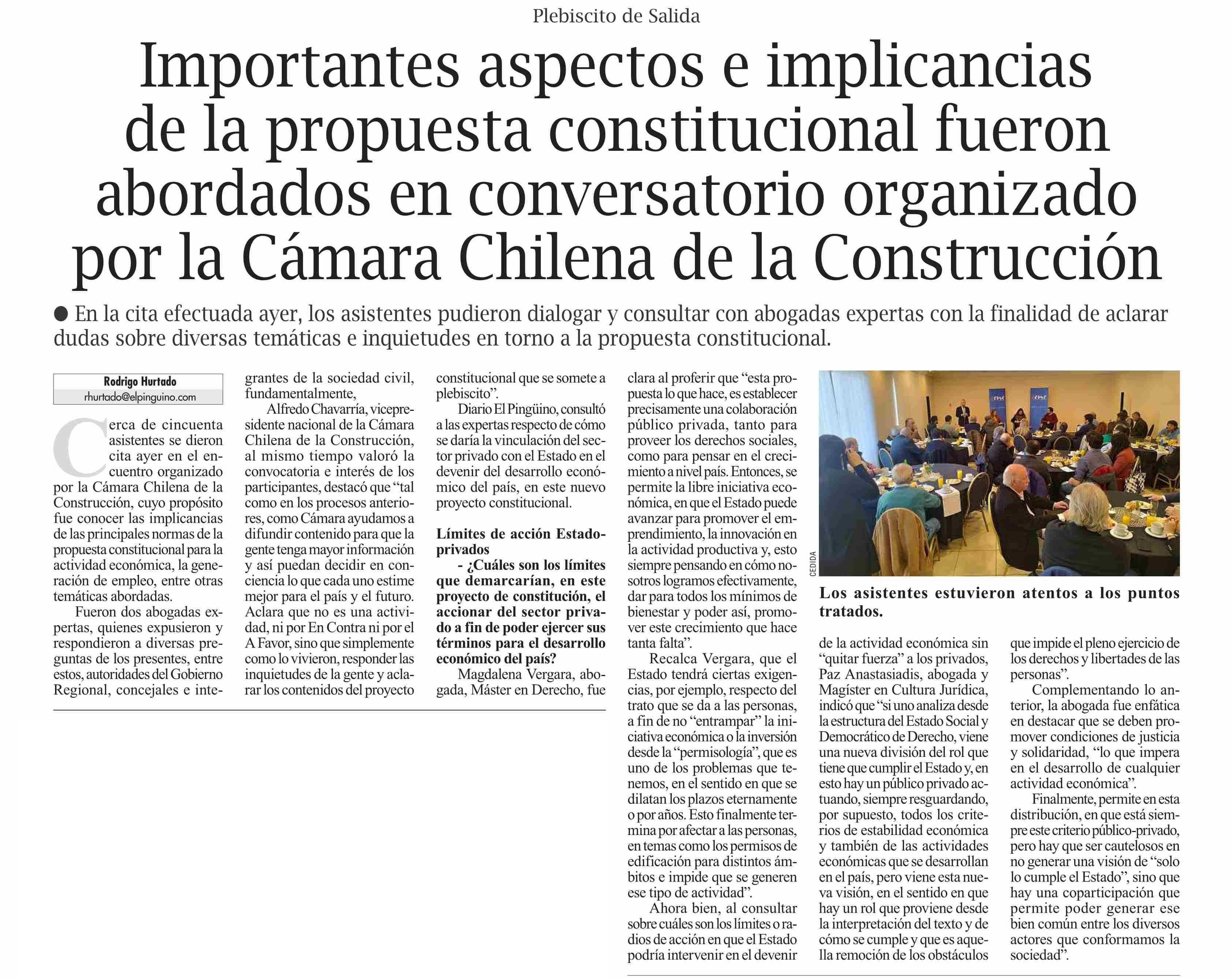 Importantes aspectos e implicancias de la propuesta constitucional fueron abordados en conversatorio organizado por la Cámara Chilena de la Construcción 02-12-2023 El Pingüino |
