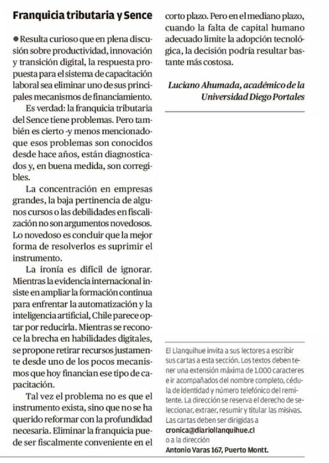 CARTAS: Franquicia tributaria y Sence 26-04-2026 El Llanquihue |