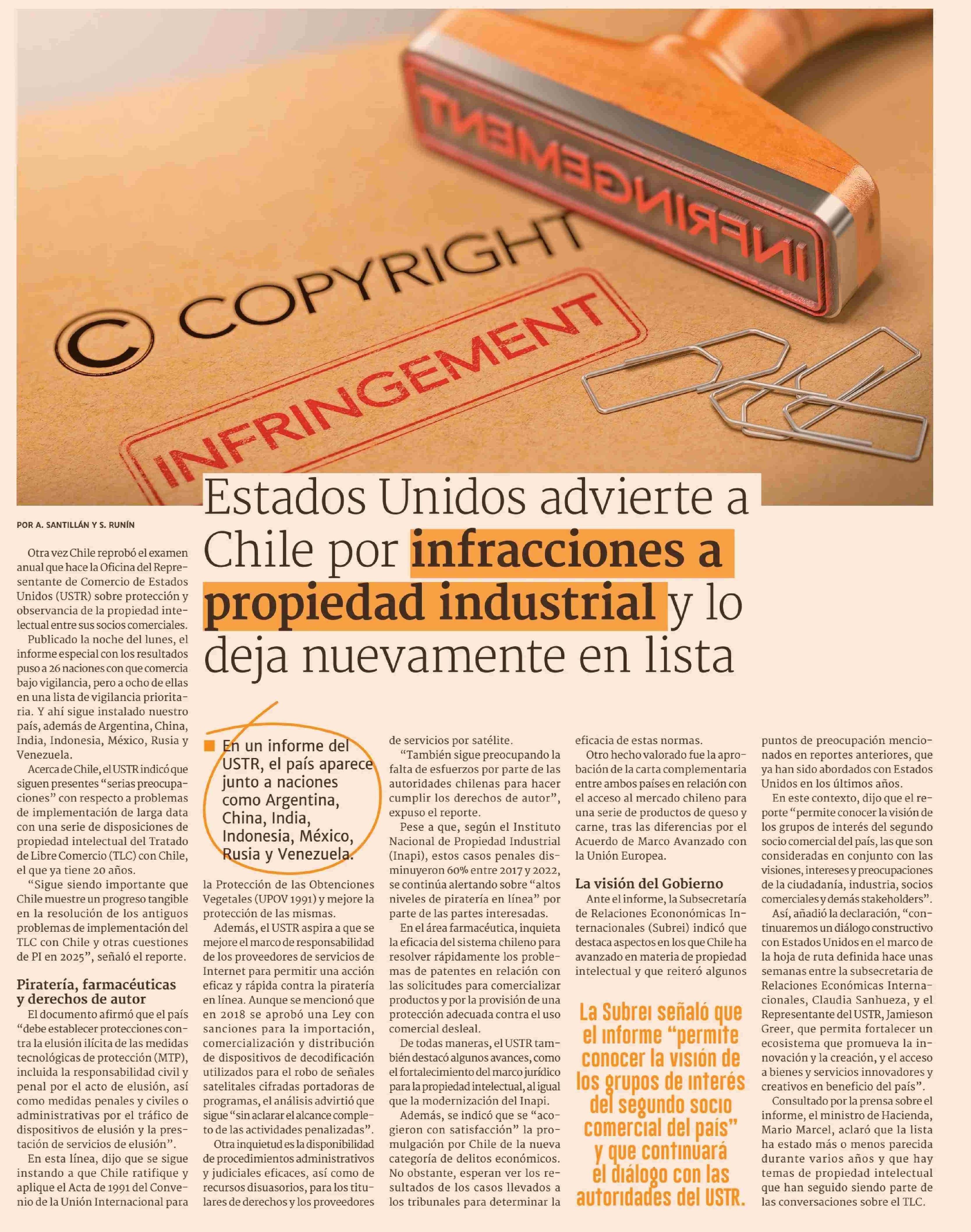 Estados Unidos advierte a Chile por infracciones a propiedad industrial y lo deja nuevamente en lista 30-04-2025 Diario Financiero |