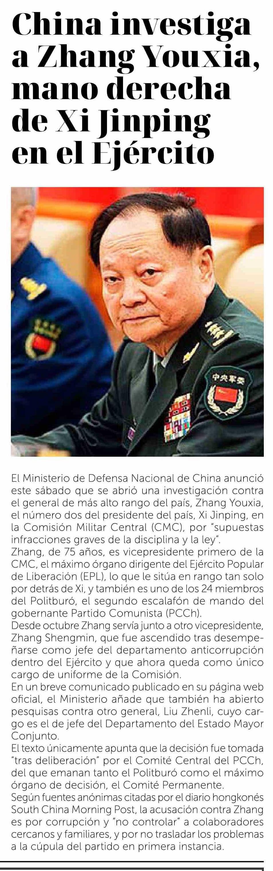 | Título: | China investiga a Zhang Youxia, mano derecha de Xi Jinping en el Ejército |