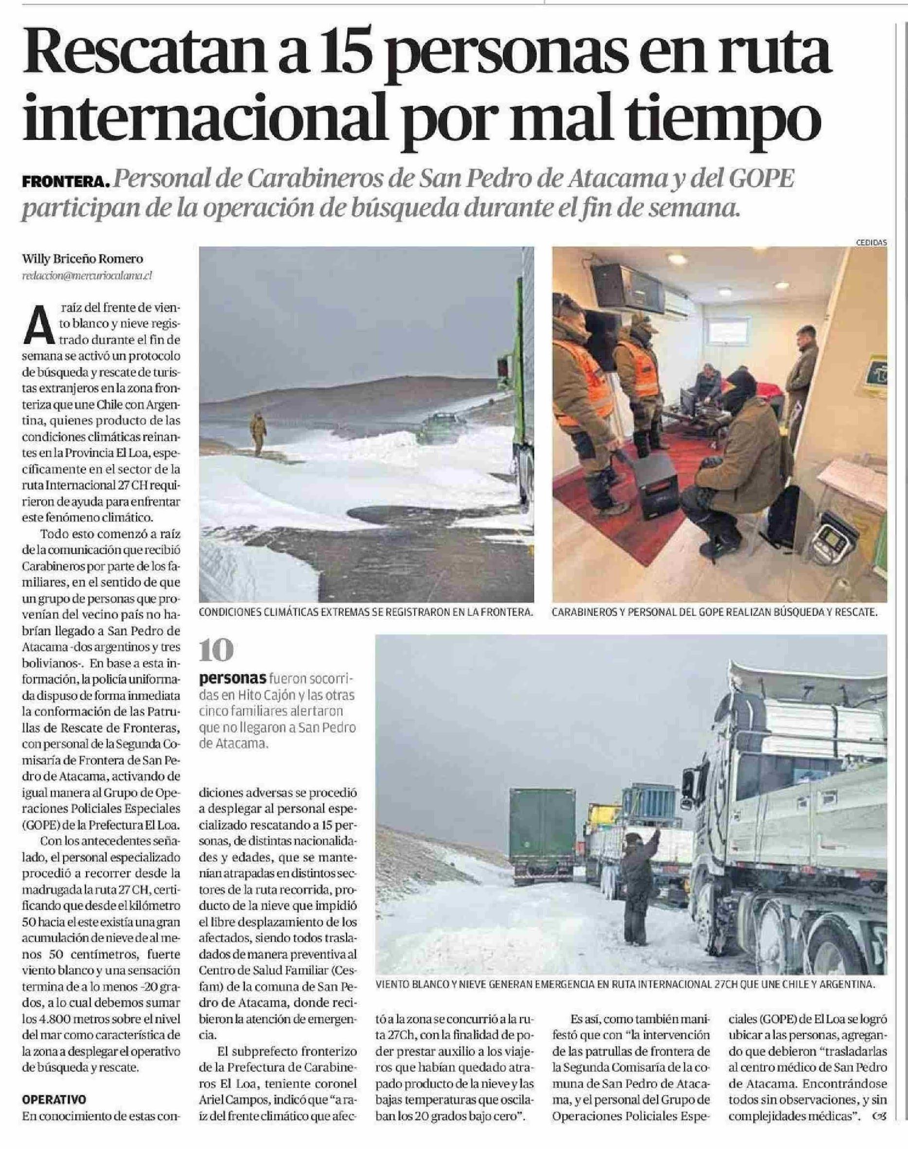 Rescatan a 15 personas en ruta internacional por mal tiempo 16-06-2025 El Mercurio de Calama |