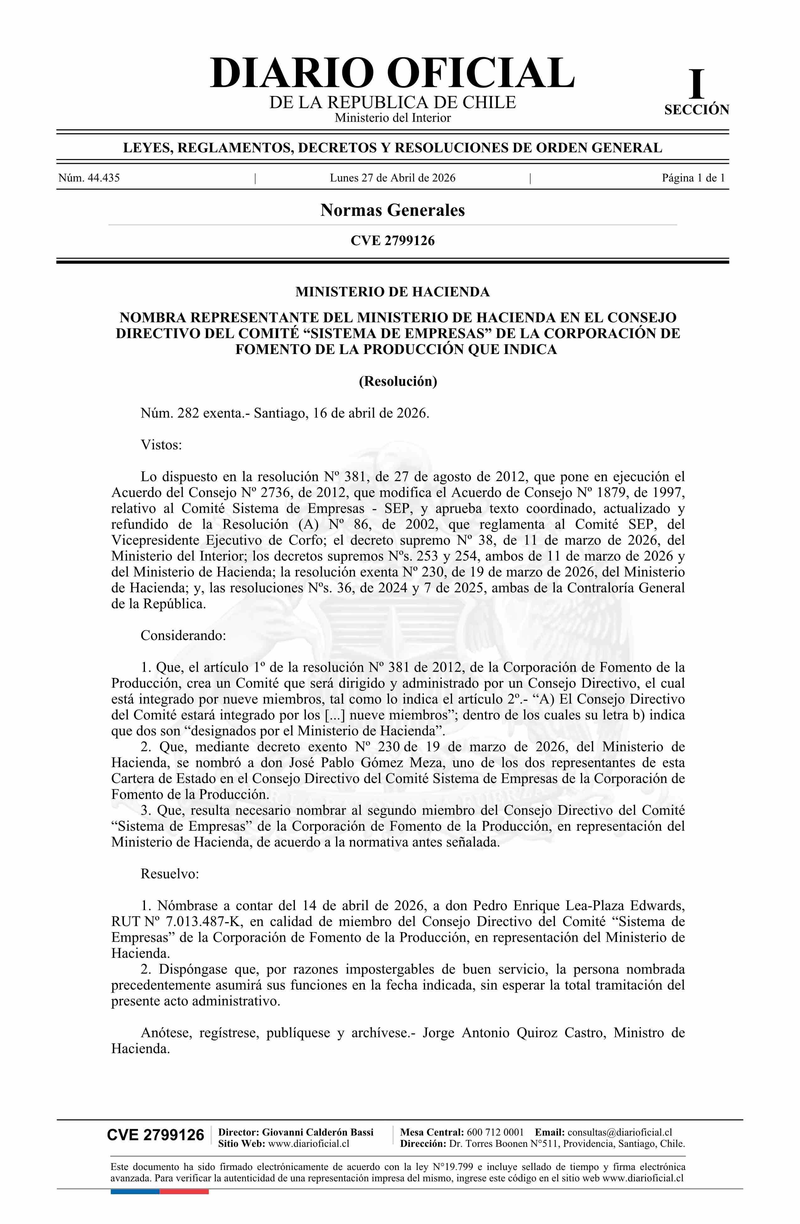 | Título: | Resolución exenta número 282, de 2026.- Nombra a don Pedro Enrique Lea-Plaza Edwards como representante del Ministerio de Hacienda en el Consejo Directivo del Comité Sistema de Empresas de la Corporación de Fomento de la Producción |