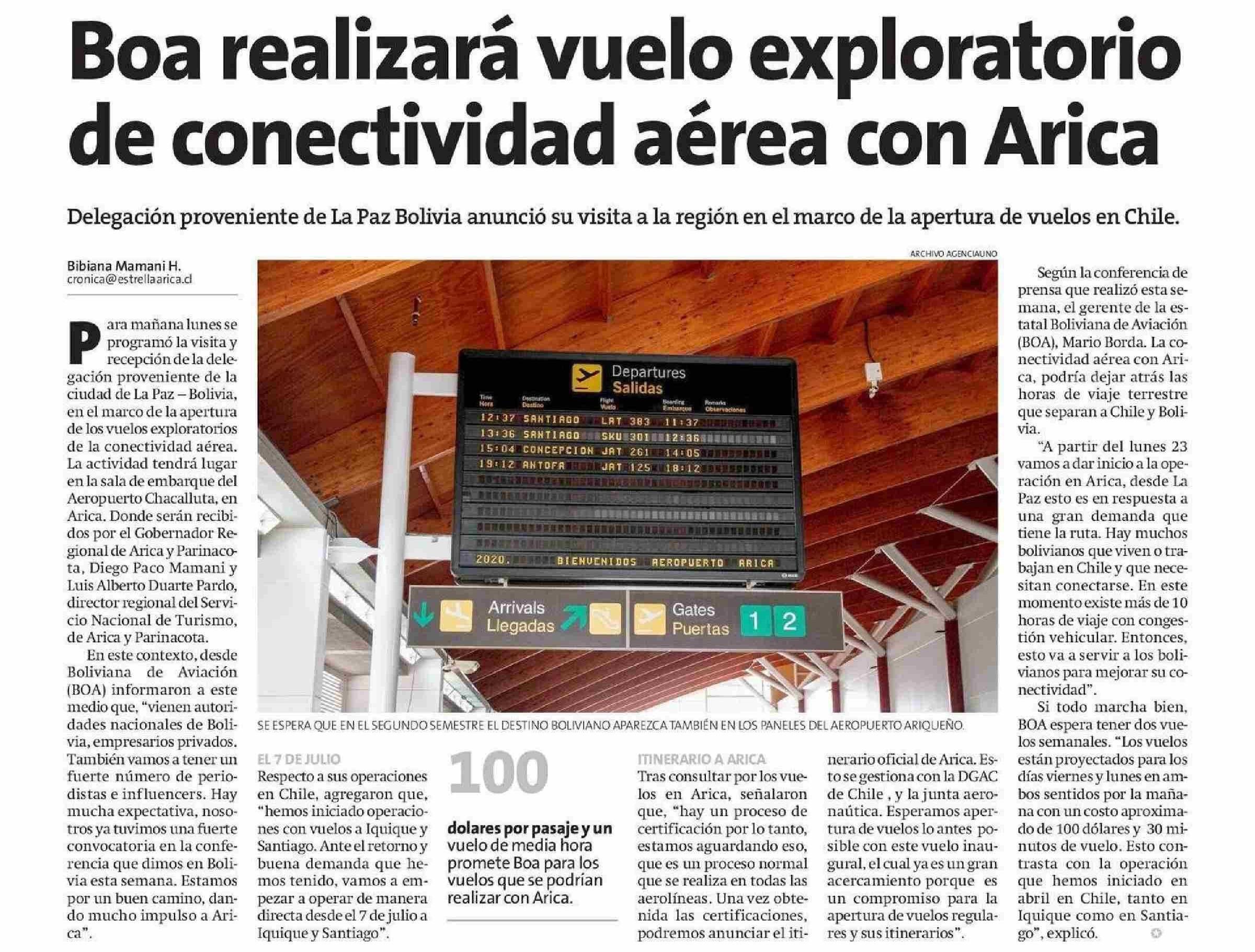 Boa realizará vuelo exploratorio de conectividad aérea con Arica 22-06-2025 La Estrella de Arica |