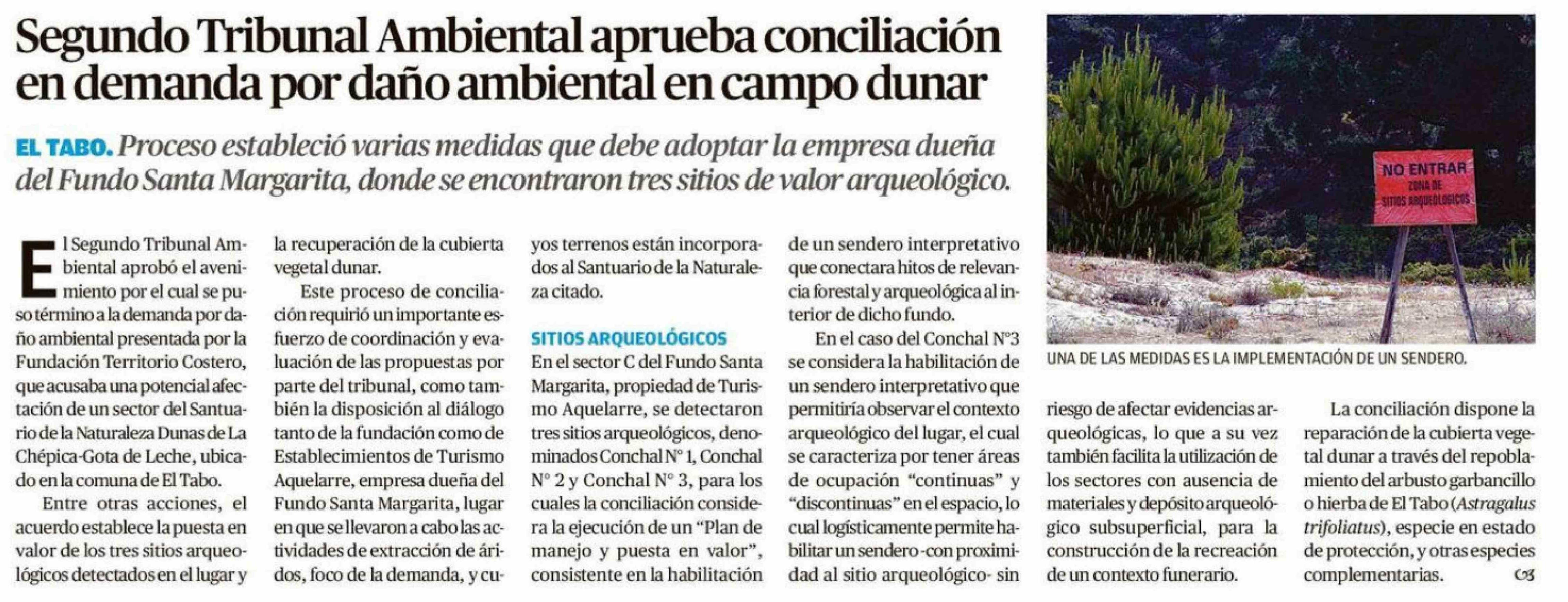 Segundo Tribunal Ambiental aprueba conciliación en demanda por daño ambiental en campo dunar 03-02-2026 El Mercurio de Valparaíso |