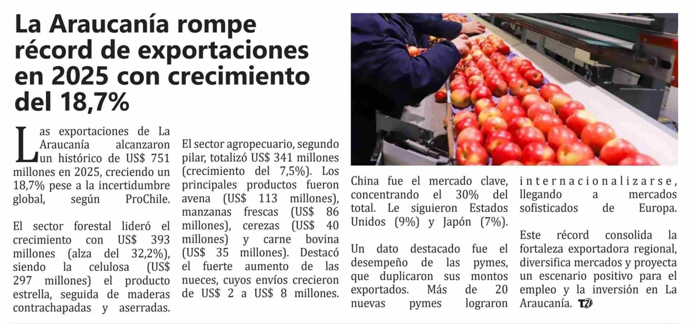 | Título: | La Araucanía rompe récord de exportaciones en 2025 con crecimiento del 18,7% |