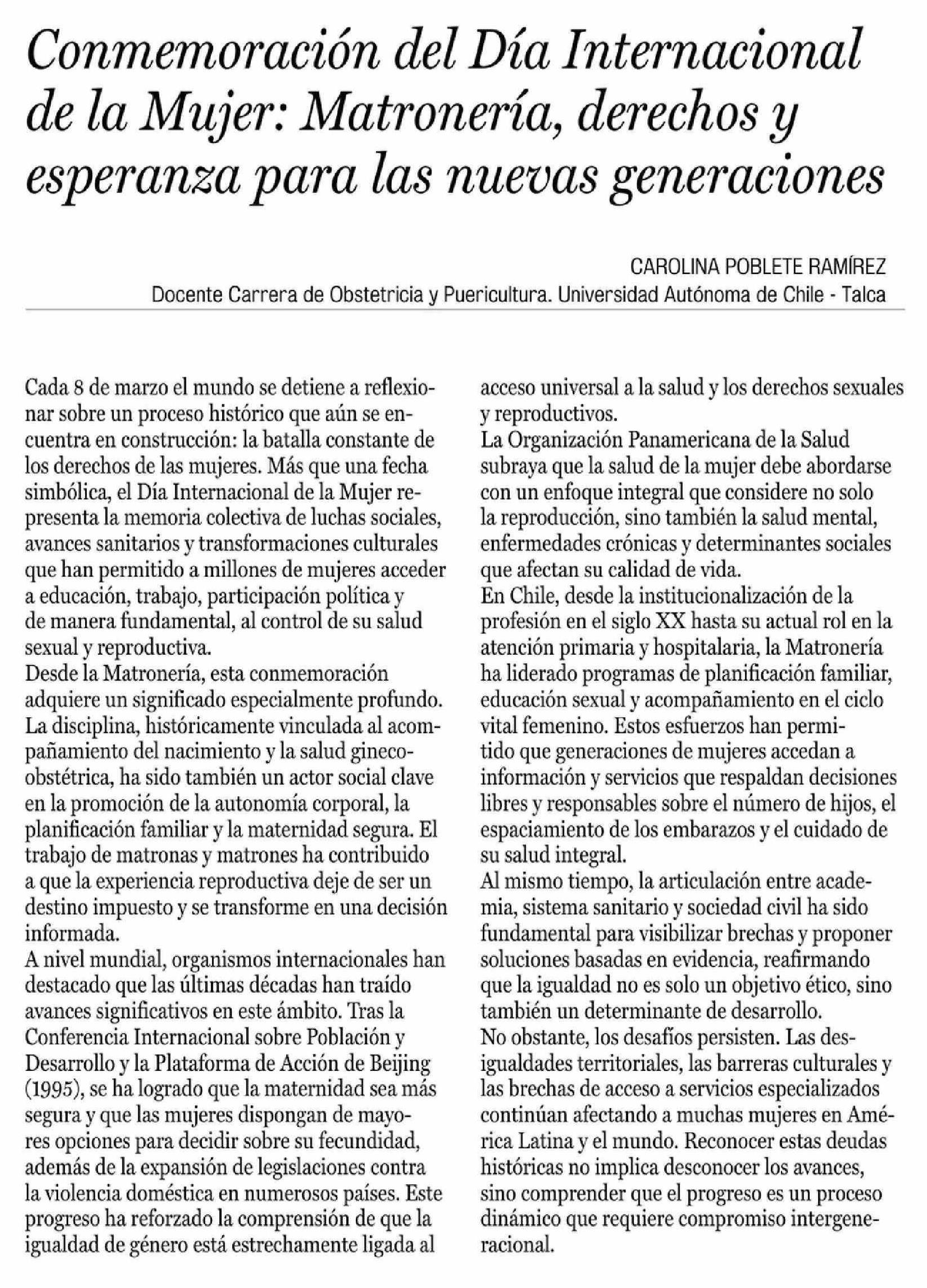 Cartas: Conmemoración del Día Internacional de la Mujer: Matronería, derechos y esperanza para las nuevas generaciones