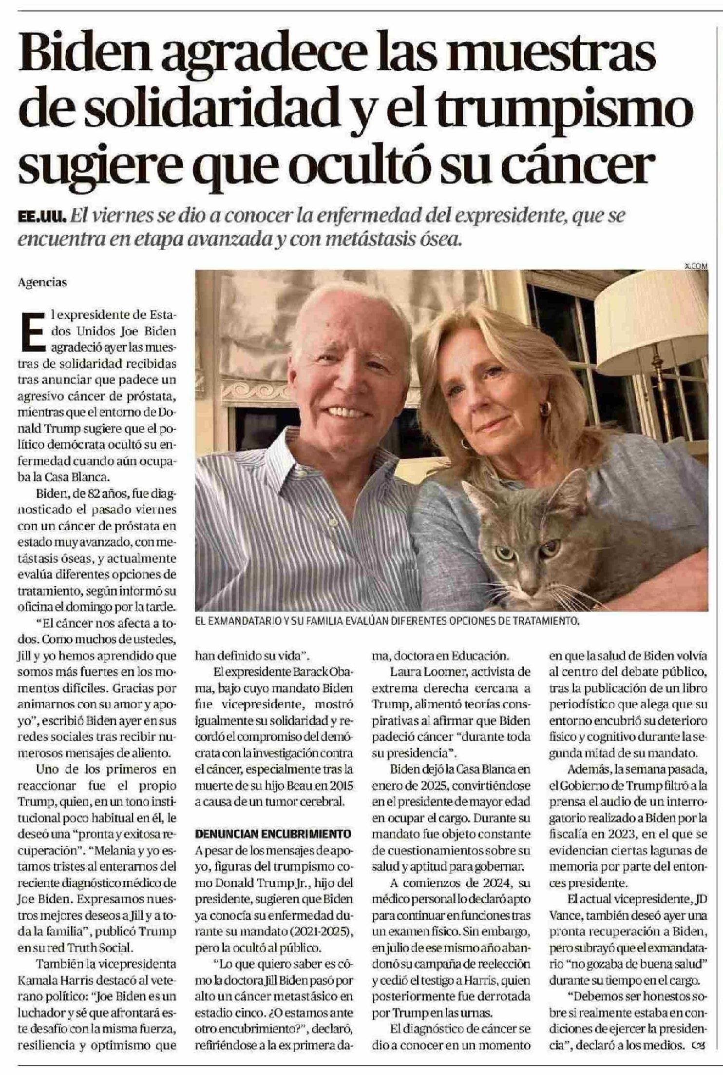 Biden agradece las muestras de solidaridad y el trumpismo sugiere que ocultó su cáncer 20-05-2025 El Austral de Osorno |