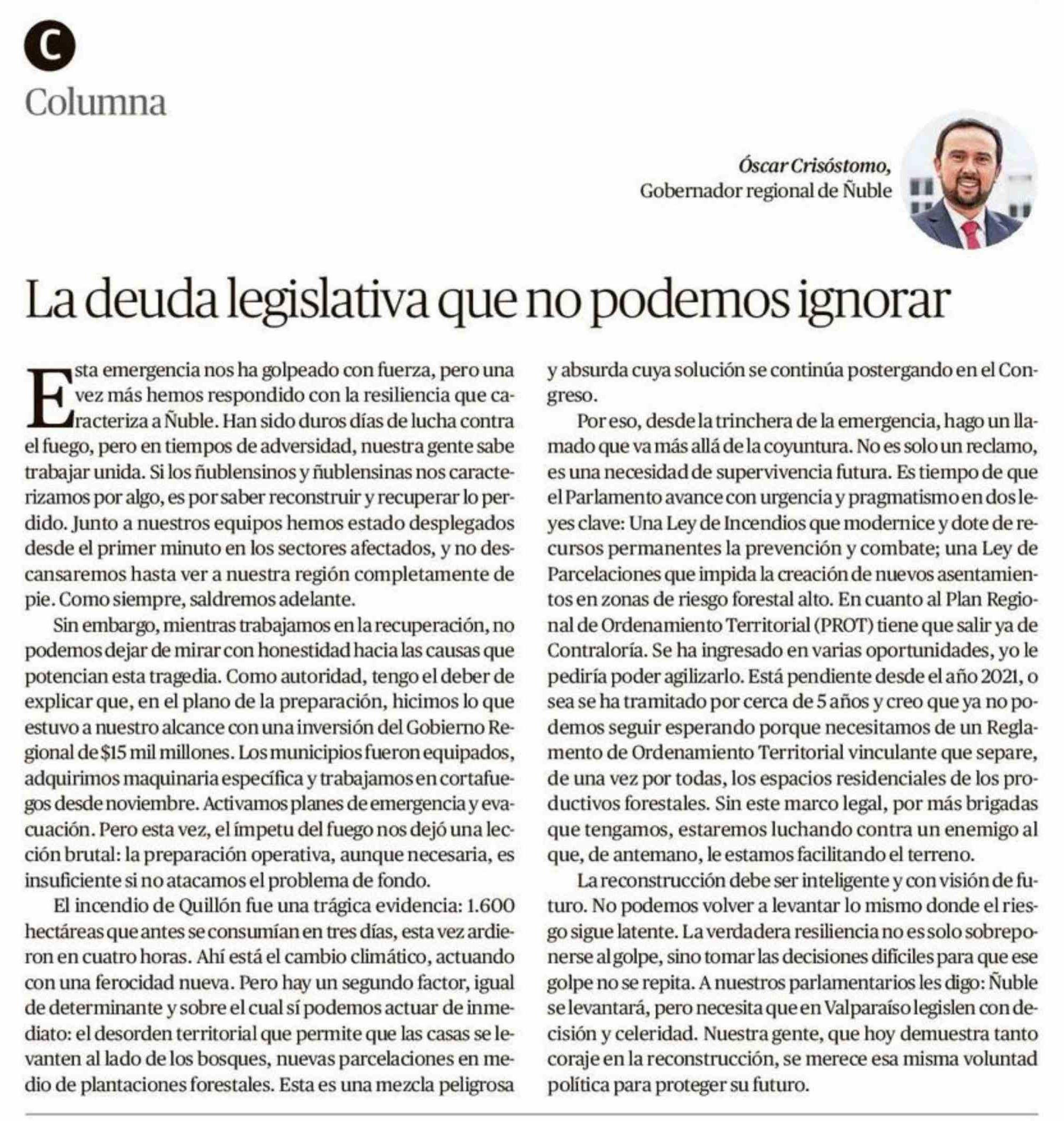 Columnas de Opinión: La deuda legislativa que no podemos ignorar 22-01-2026 Crónica de Chillán |