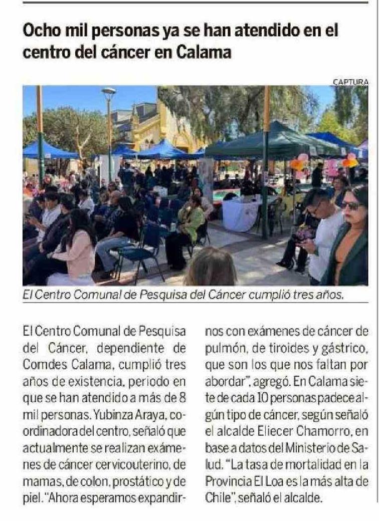 | Título: | El Centro Comunal de Pesquisa del Cáncer, dependiente de Comdes Calama, cumplió tres años de existencia, periodo en que se han atendido a más de 8 mil personas. Yubinza Araya, coordinadora del centro, señaló que actualmente se realizan examenes de cáncer cervicouterino, de mamas, de colon, prostátic |
