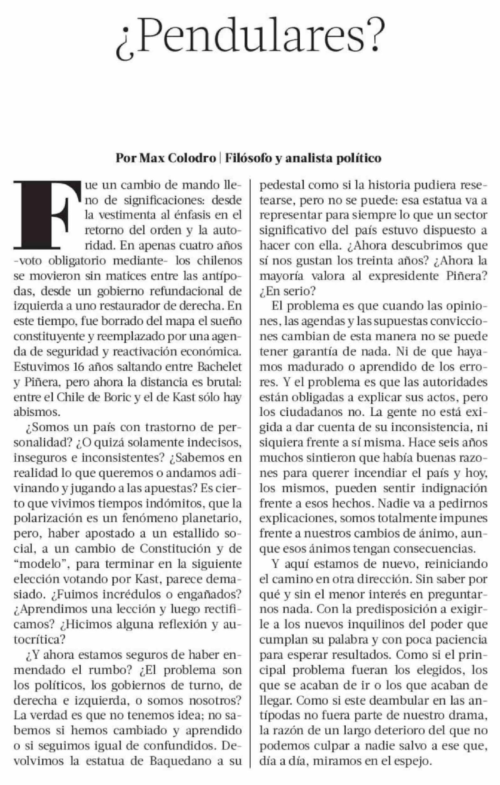 Columnas de Opinión: ¿Pendulares? 15-03-2026 La Tercera |