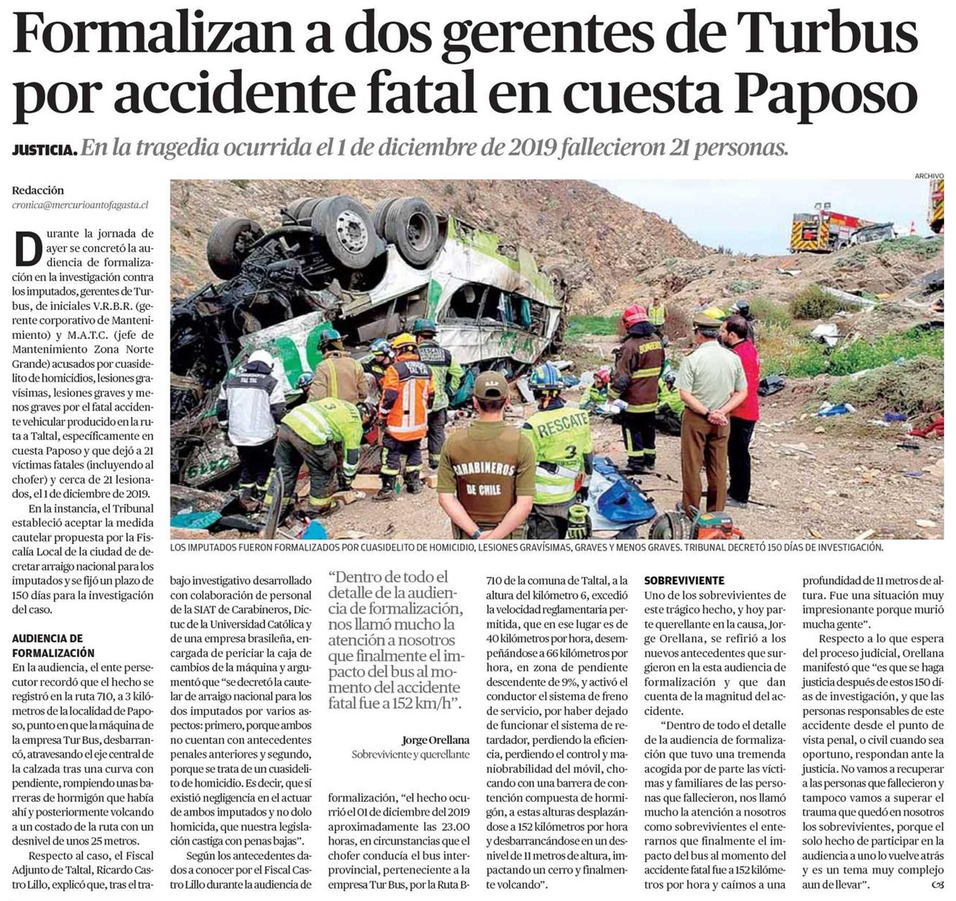 Formalizan a dos gerentes de Turbus por accidente fatal en cuesta Paposo 01-07-2022 El Mercurio de Calama |