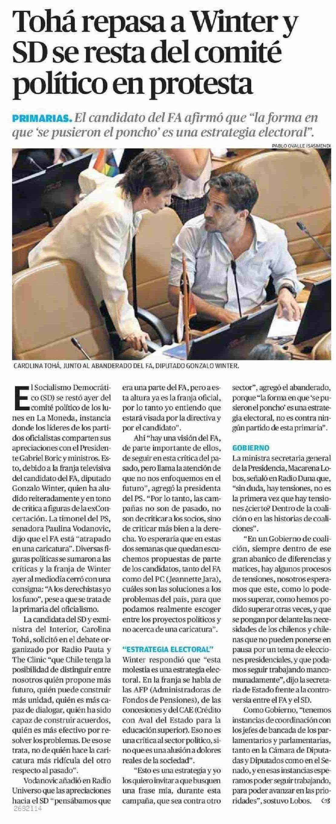Tohá repasa a Winter y SD se resta del comité político en protesta 17-06-2025 El Mercurio de Calama |