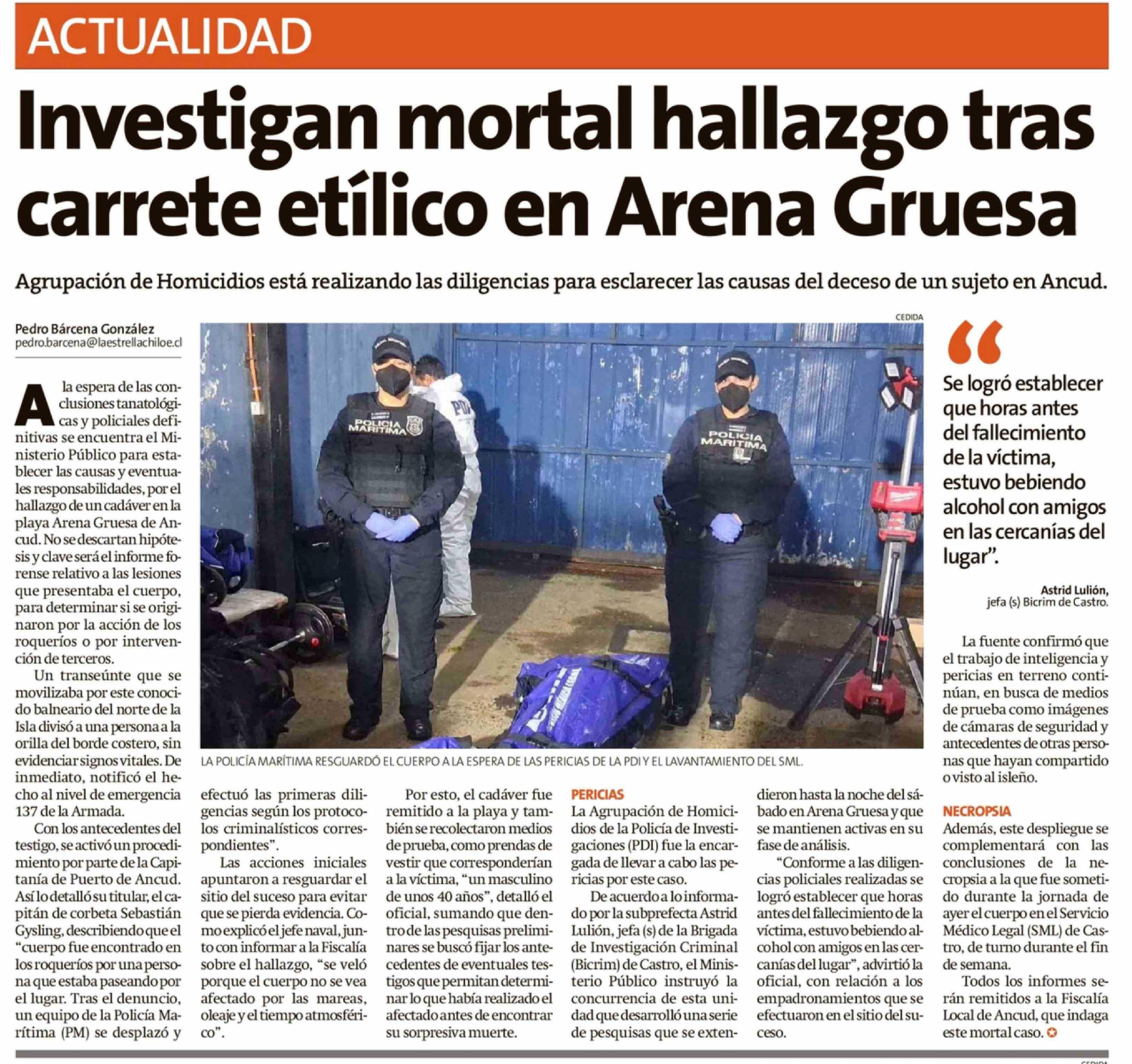 Título: Investigan mortal hallazgo tras carrete etílico en Arena Gruesa