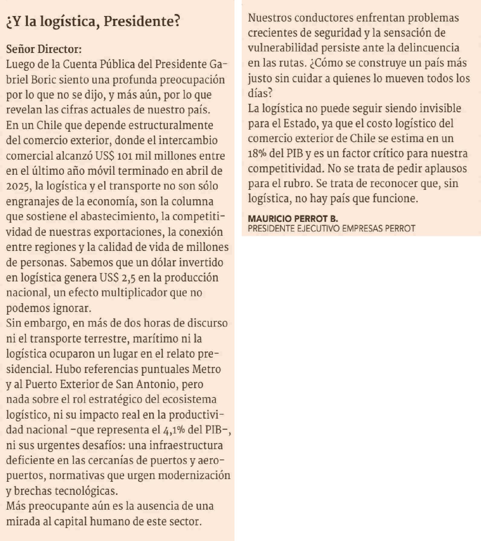 CARTAS: ¿Y la logística, Presidente? 19-06-2025 Diario Financiero |