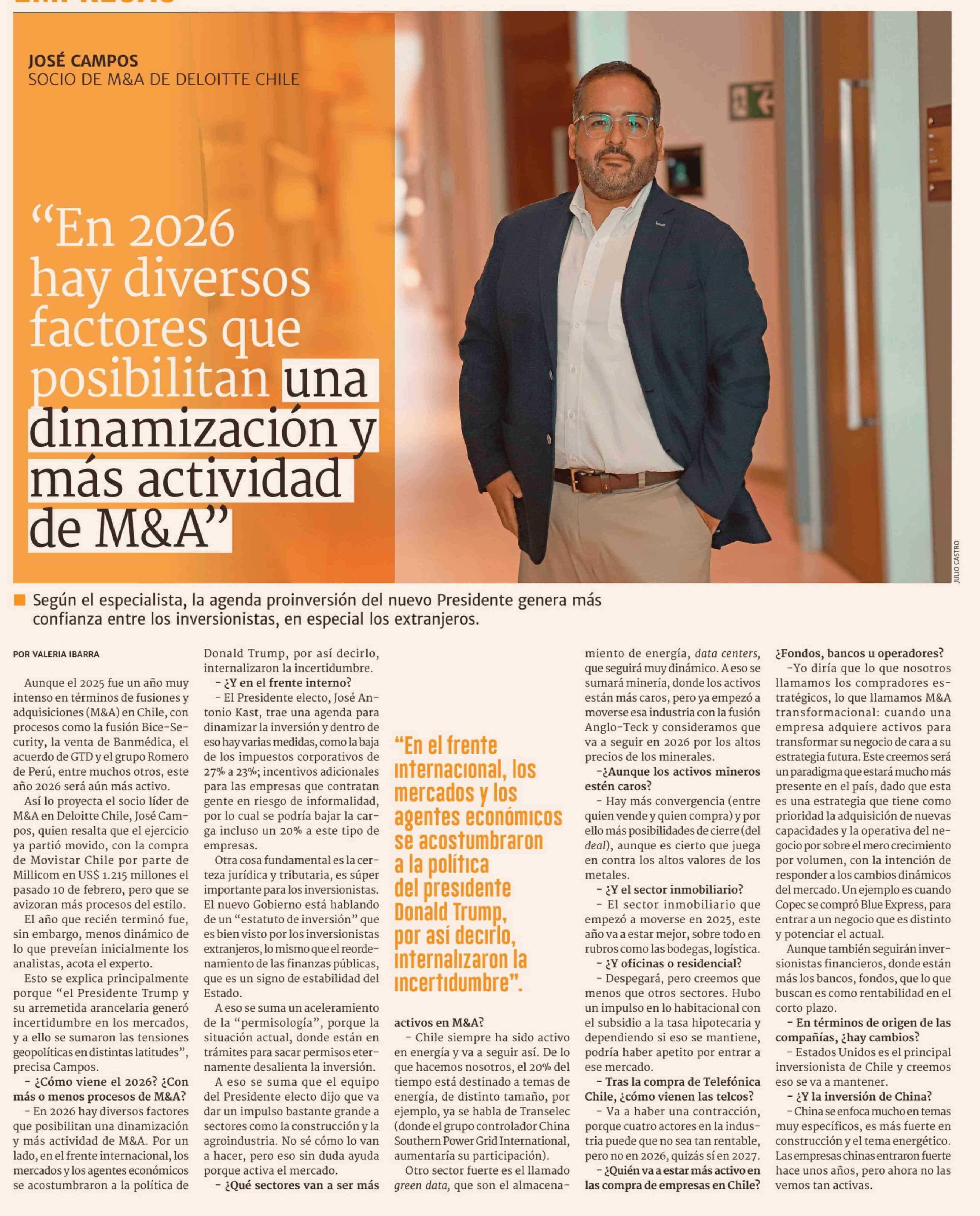 "En 2026 hay diversos factores que posibilitan una dinamización y más actividad de M&A" 02-03-2026 Diario Financiero |