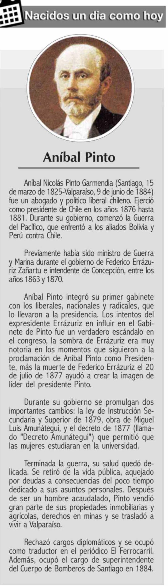 | Título: | Aníbal Nicolás Pinto Garmendia (Santiago, 15 de marzo de 1825-Valparaíso, 9 de junio de 1884) fue un abogado y político liberal chileno. Ejerció como presidente de Chile en los años 1876 hasta 1881. Durante su gobierno, comenzó la Guerra del Pacífico, que enfrentó a los aliados Bolivia y Perú contra |