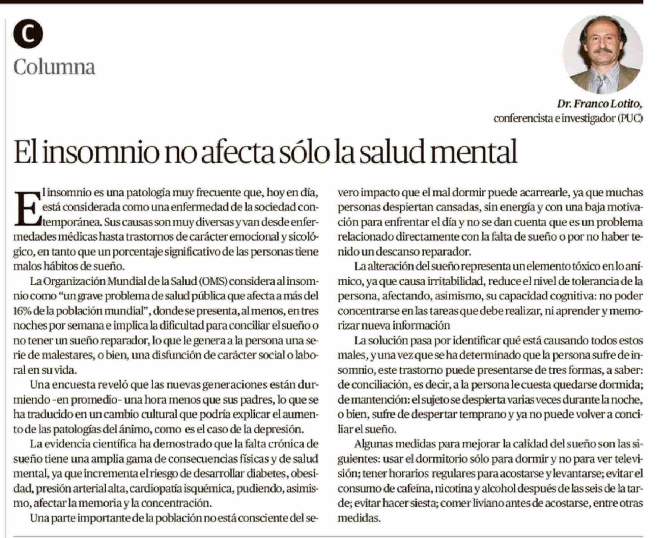 Título: Columnas de Opinión: El insomnio no afecta sólo la salud mental