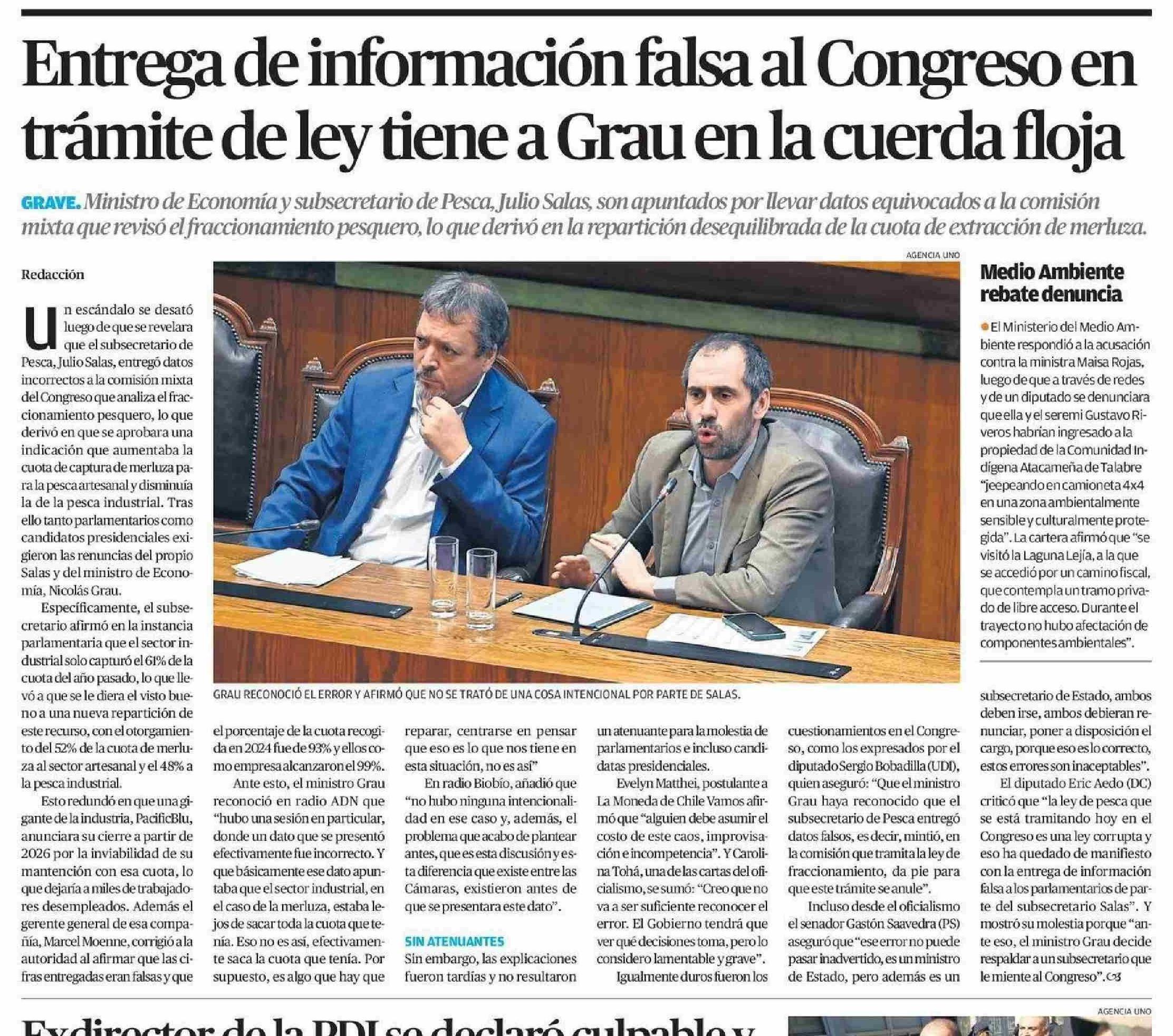 Entrega de información falsa al Congreso en trámite de ley tiene a Grau en la cuerda floja 10-05-2025 El Mercurio de Antofagasta |