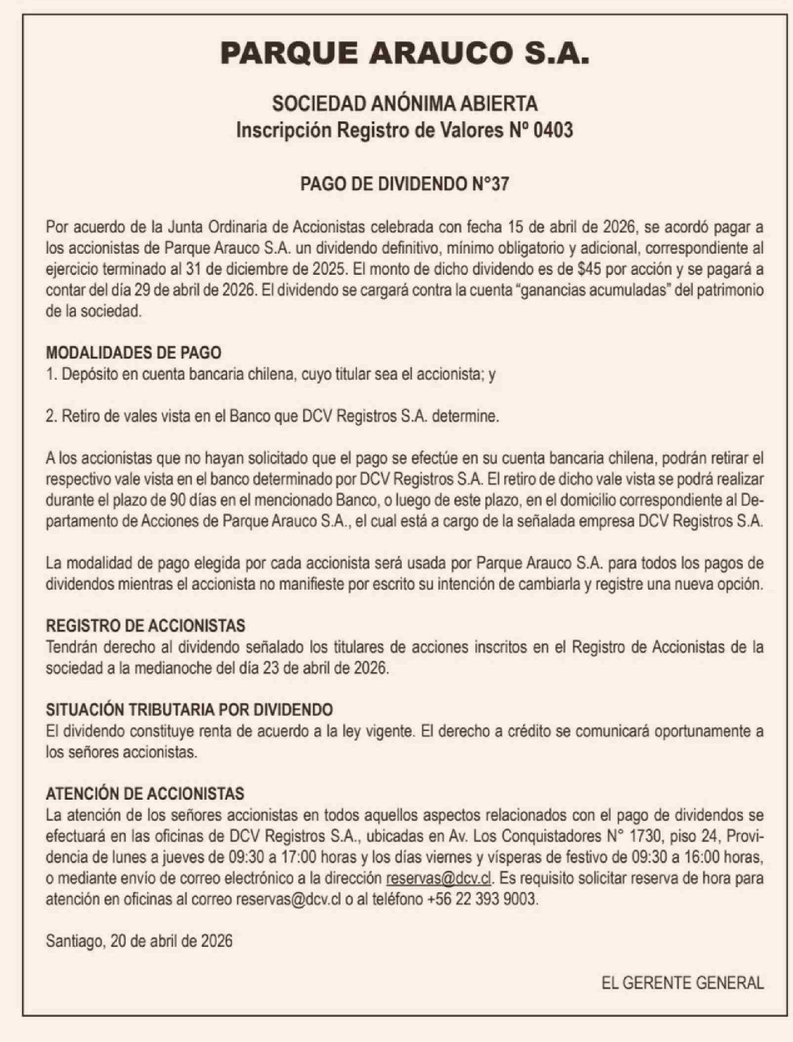 Título: AVISO: PARQUE ARAUCO S.A.