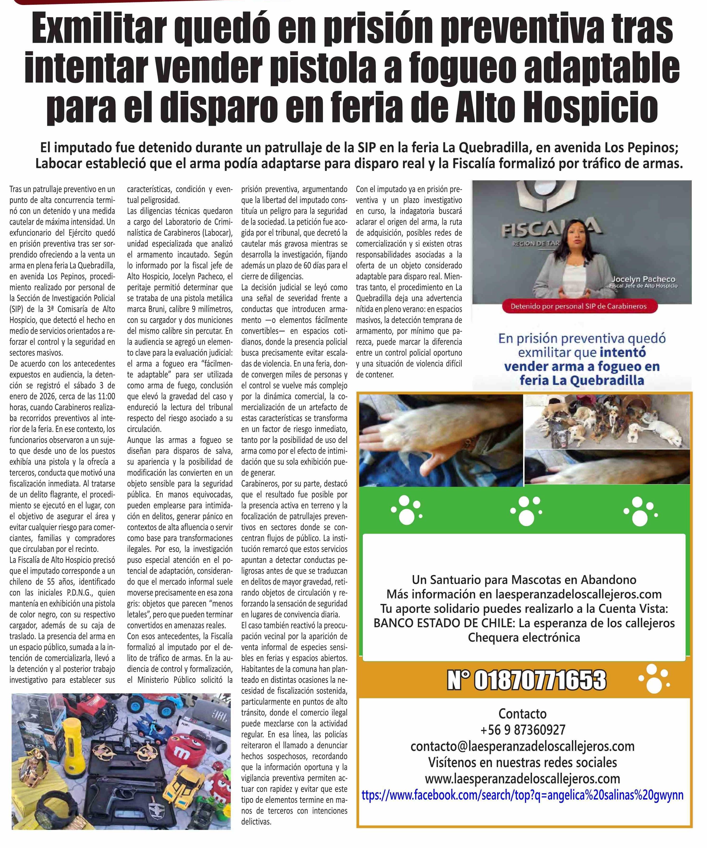 Exmilitar quedó en prisión preventiva tras intentar vender pistola a fogueo adaptable para el disparo en feria de Alto Hospicio 06-01-2026 El Longino |