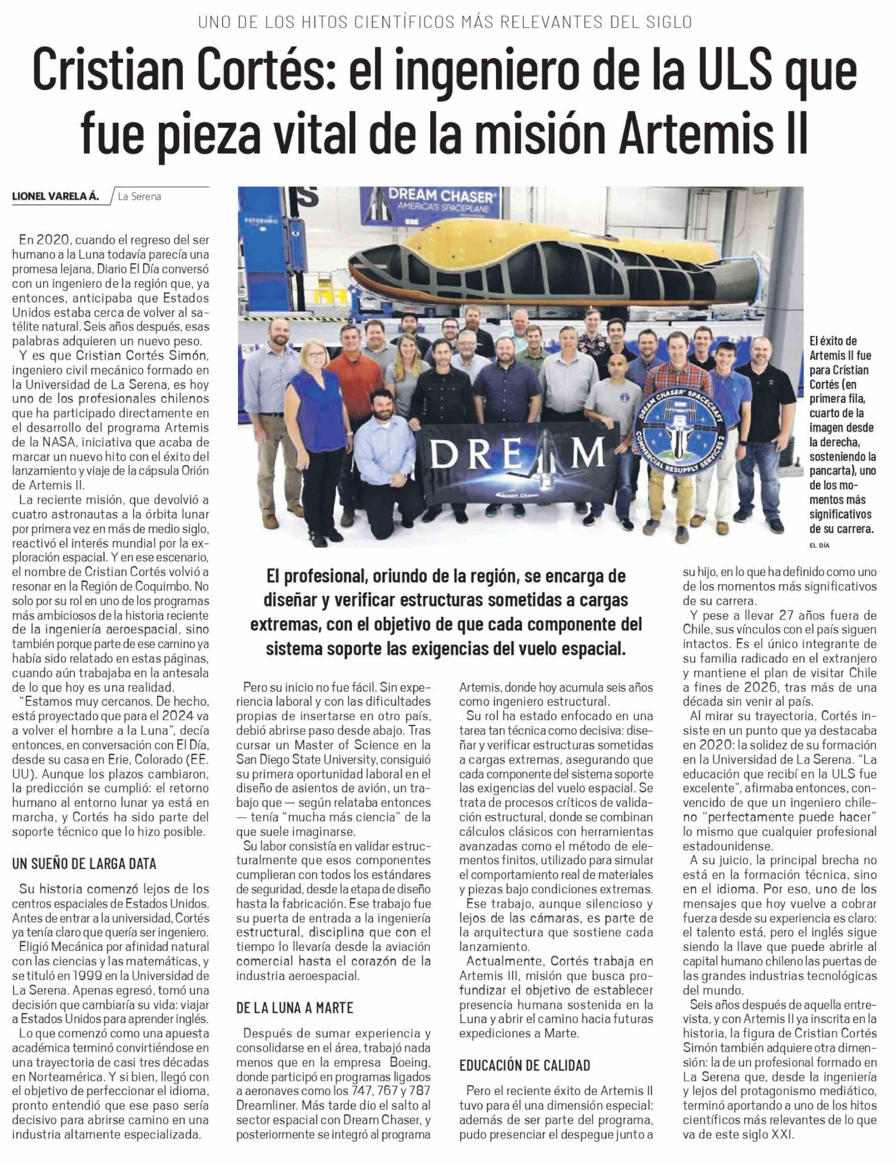 Cristian Cortés: el ingeniero de la ULS que fue pieza vital de la misión Artemis II 25-04-2026 El Día |
