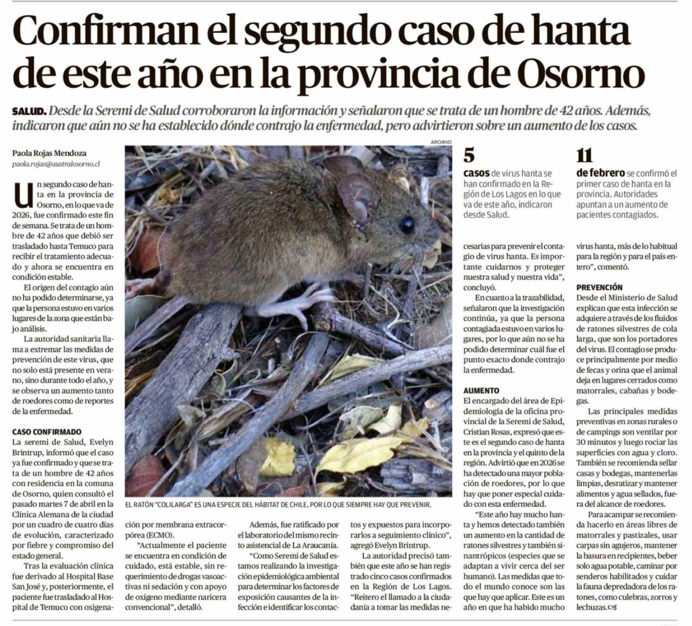 Título: Confirman el segundo caso de hanta de este año en la provincia de Osorno