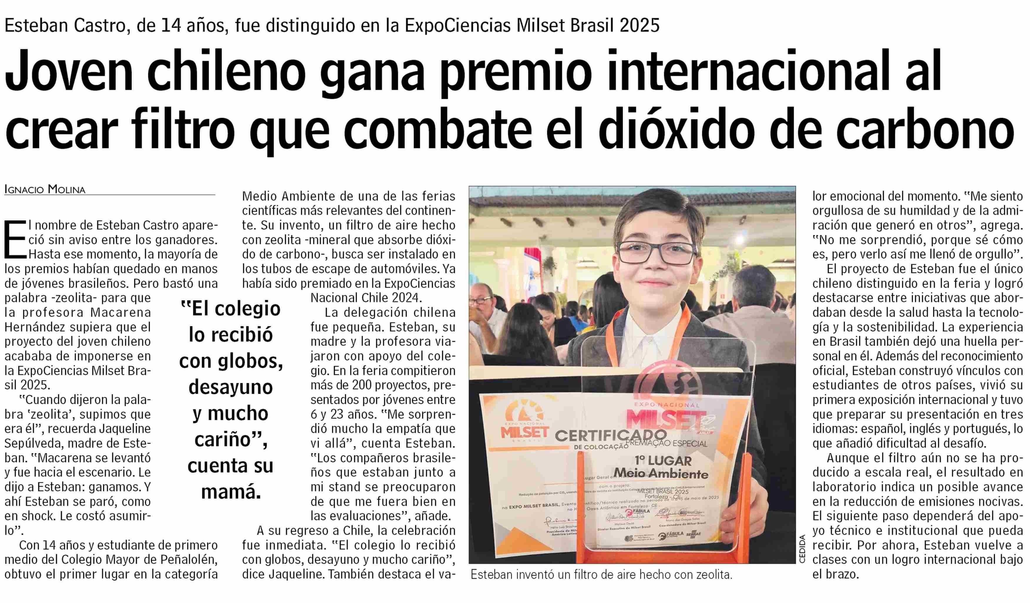 Título: Joven chileno gana premio internacional al crear filtro que combate el dióxido de carbono